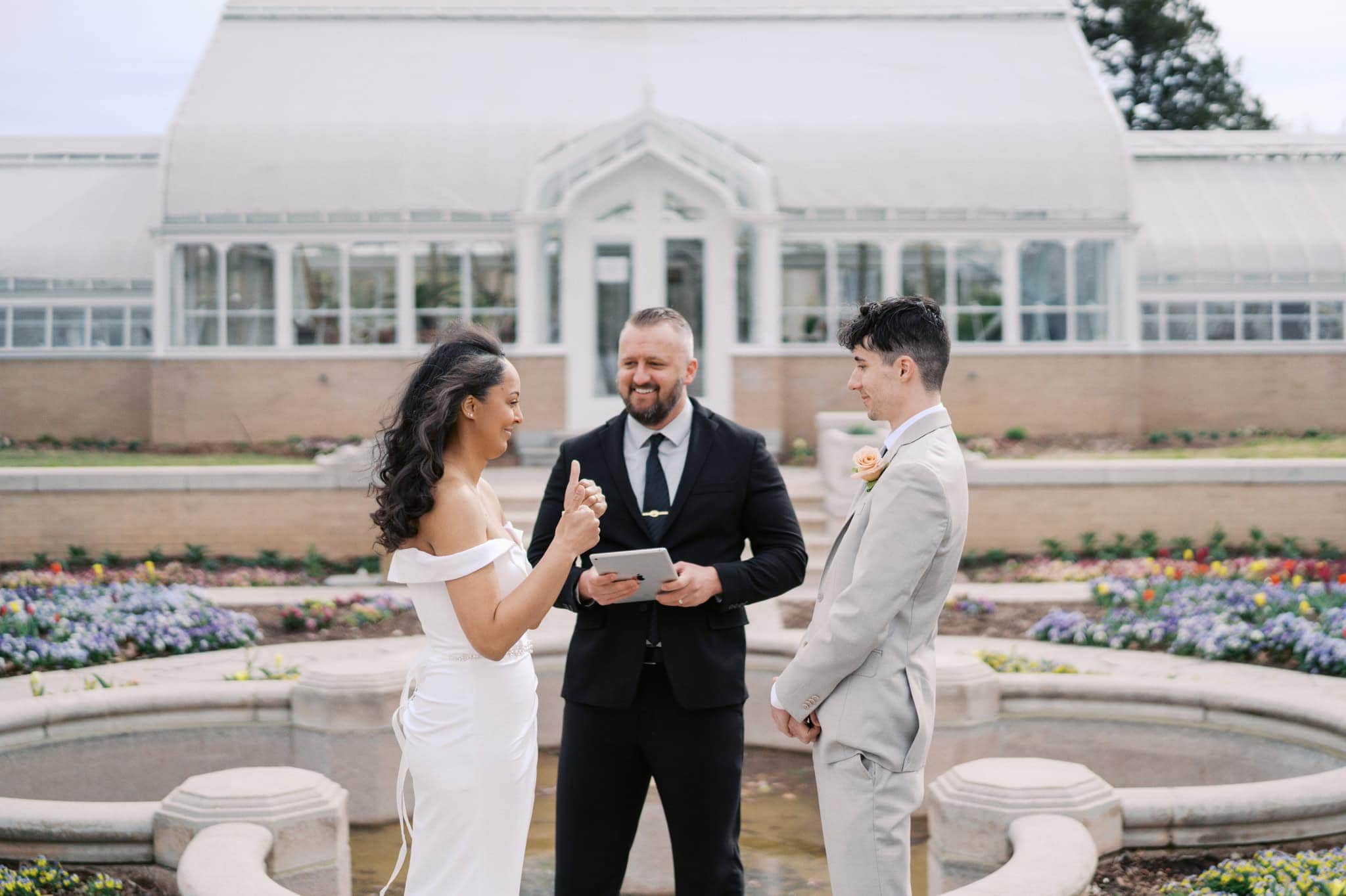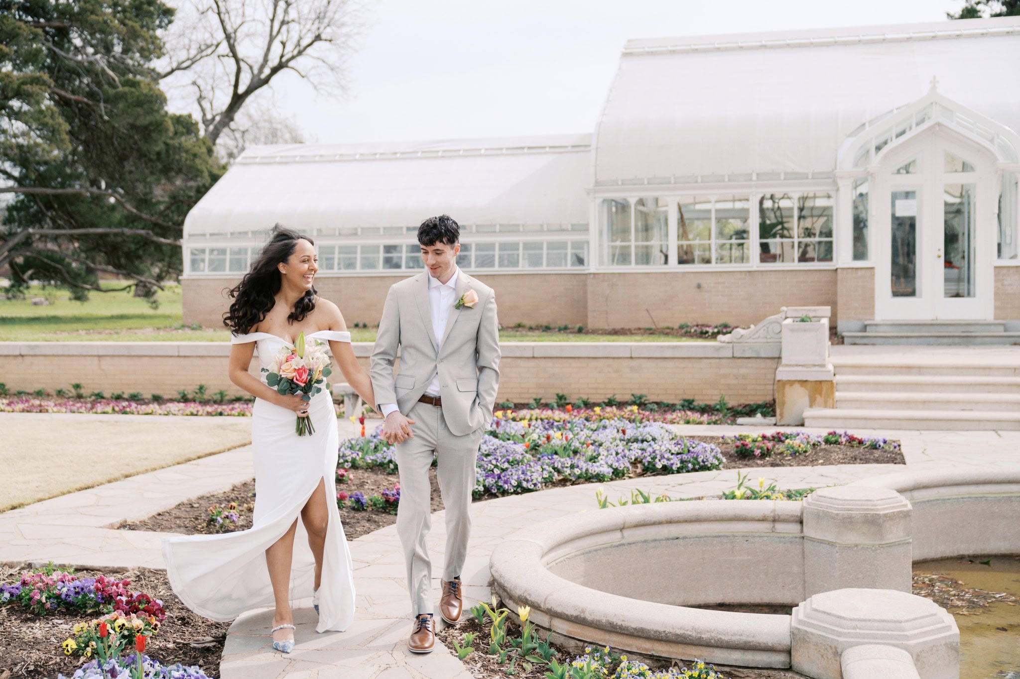 What made the day even more special was the thoughtfulness of the Tulsa Garden Center staff. Knowing Johnathan and Bricelynn’s elopement was on the horizon, the team went out of their way to prioritize planting seasonal blooms in the sunken garden directly in front of the conservatory. The effort didn’t go unnoticed. The flowers, friends, and family were joyful witnesses, basking in the morning sunshine creating an atmosphere that felt both grand and deeply personal.