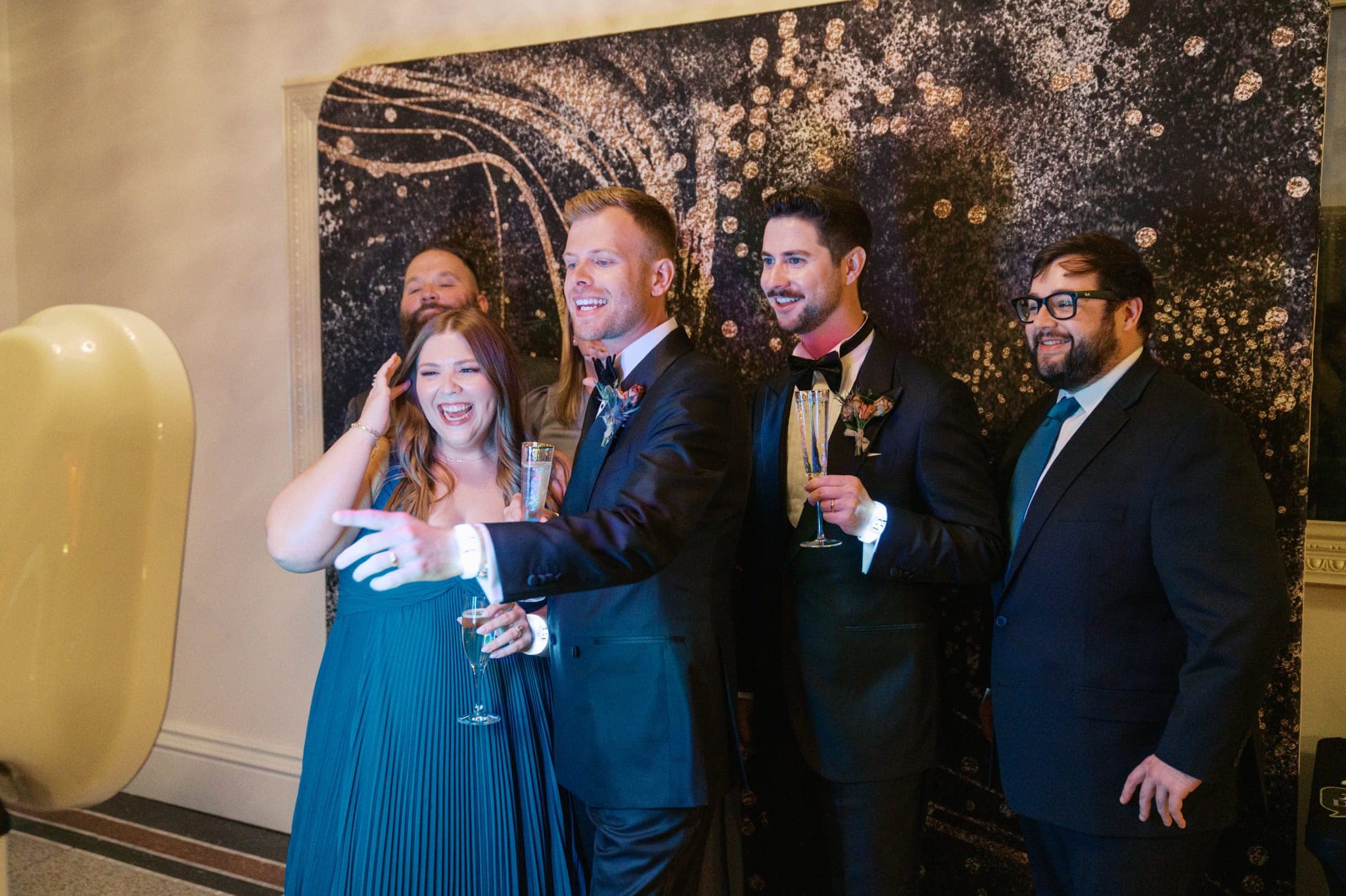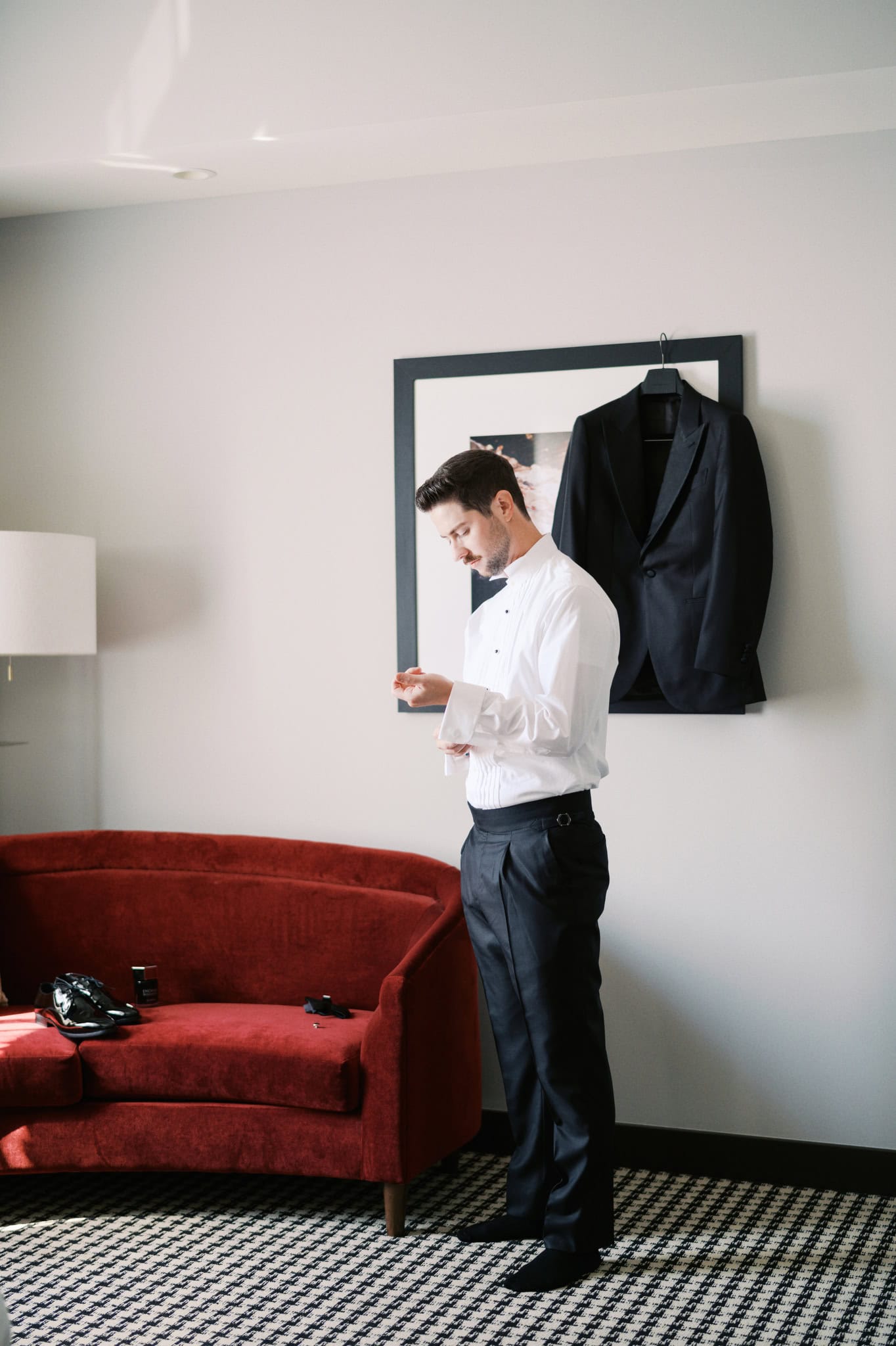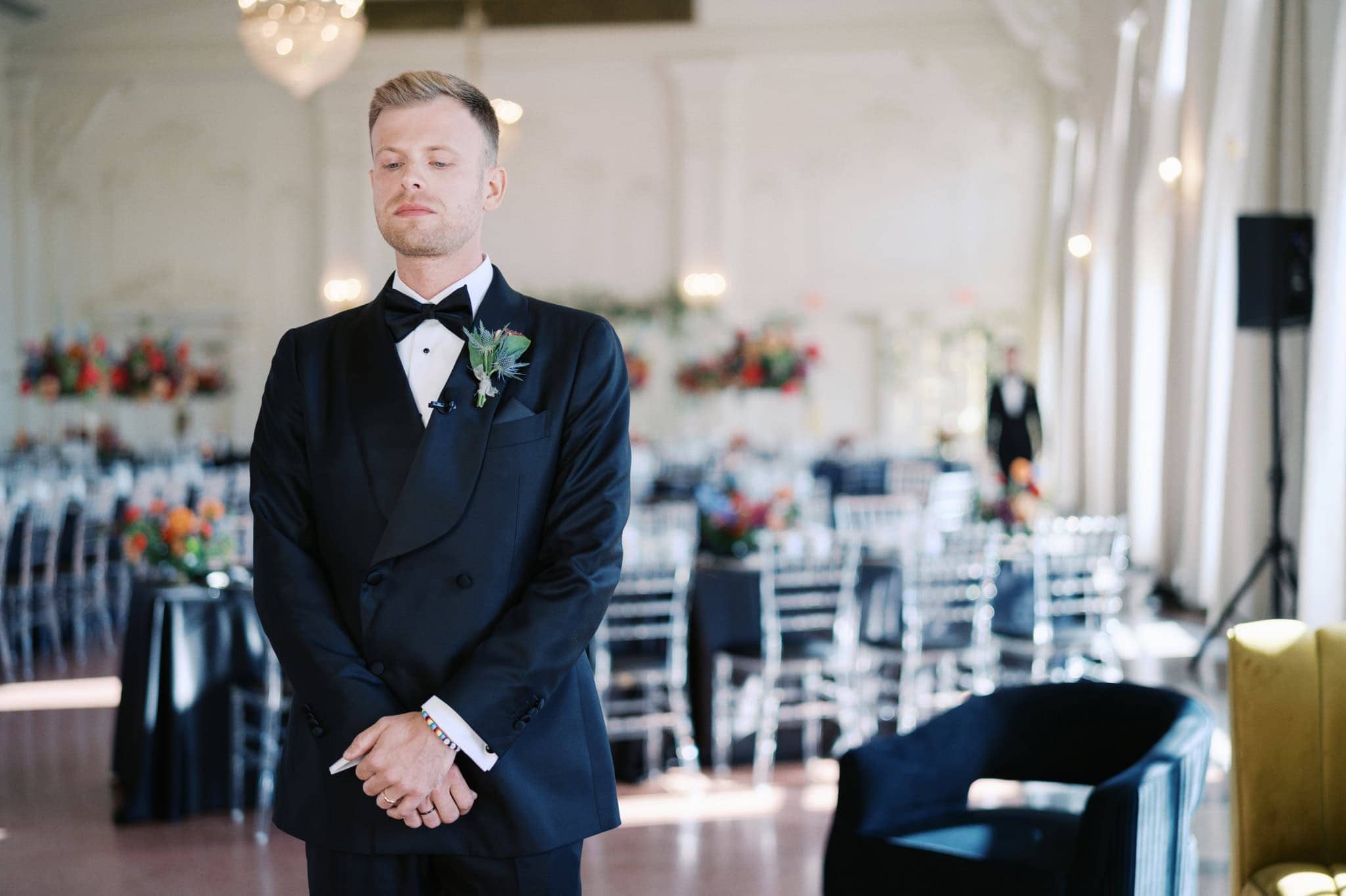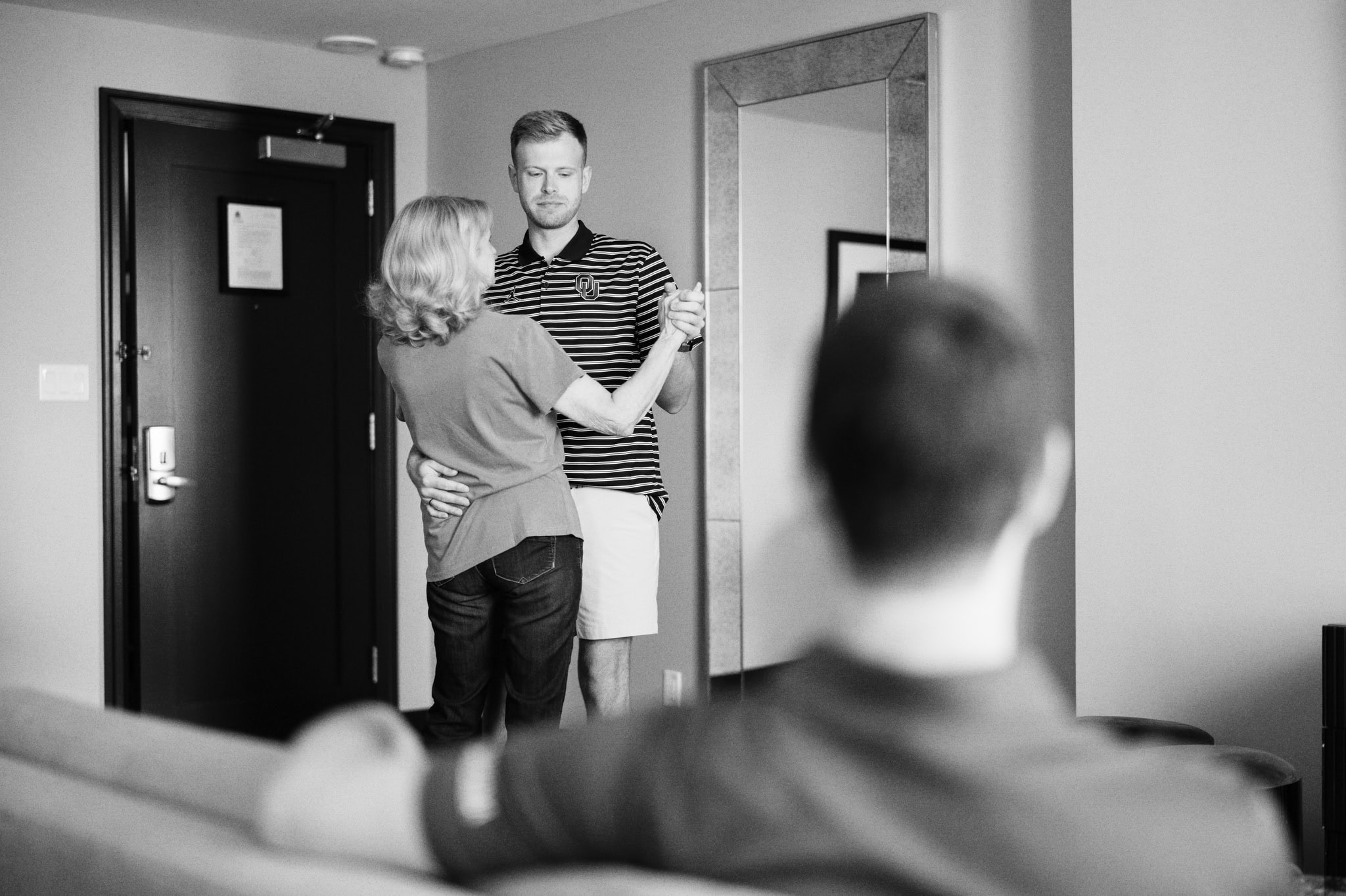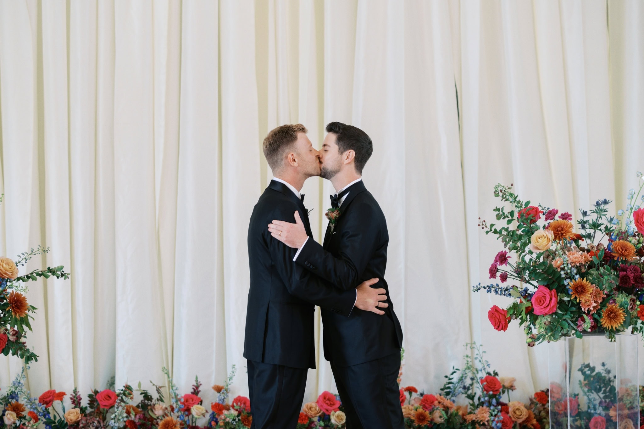 There’s something magical about wedding mornings. There’s a soft anticipation and stillness before the celebration unfolds. And at The Mayo Hotel in downtown Tulsa, that feeling is magnified. With its storied Art Deco history, soaring ceilings, and timeless glamour, The Mayo has a way of making every moment feel like it belongs in a film. Brett & Ryan’s wedding was no exception. Their day began quietly, meaningfully, and just how they wanted it. Before the suits, before the music, before the guests arrived, Brett and Ryan met up with their moms to rehearse their formal dances. It was an emotional and grounding moment, full of laughter and grace, and a beautiful way to ease into the day. After getting ready in separate rooms, the grooms met for their first look. It was a tender, quiet pause in the swirl of the day. As they exchanged personalized monogrammed cufflinks, gently fastening them onto each other. The moment became a memory in real time: intentional, emotional, and filled with quiet pride.