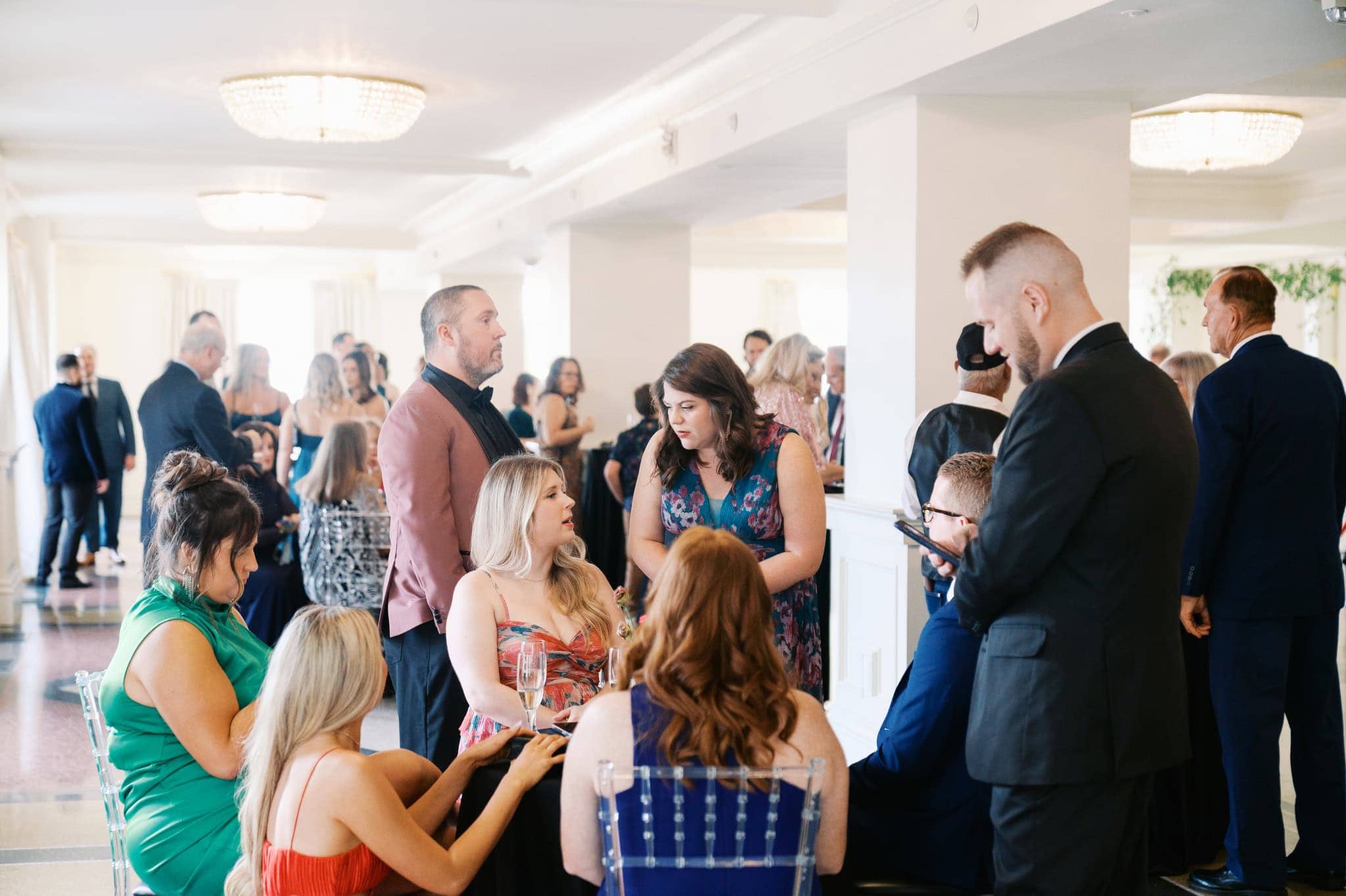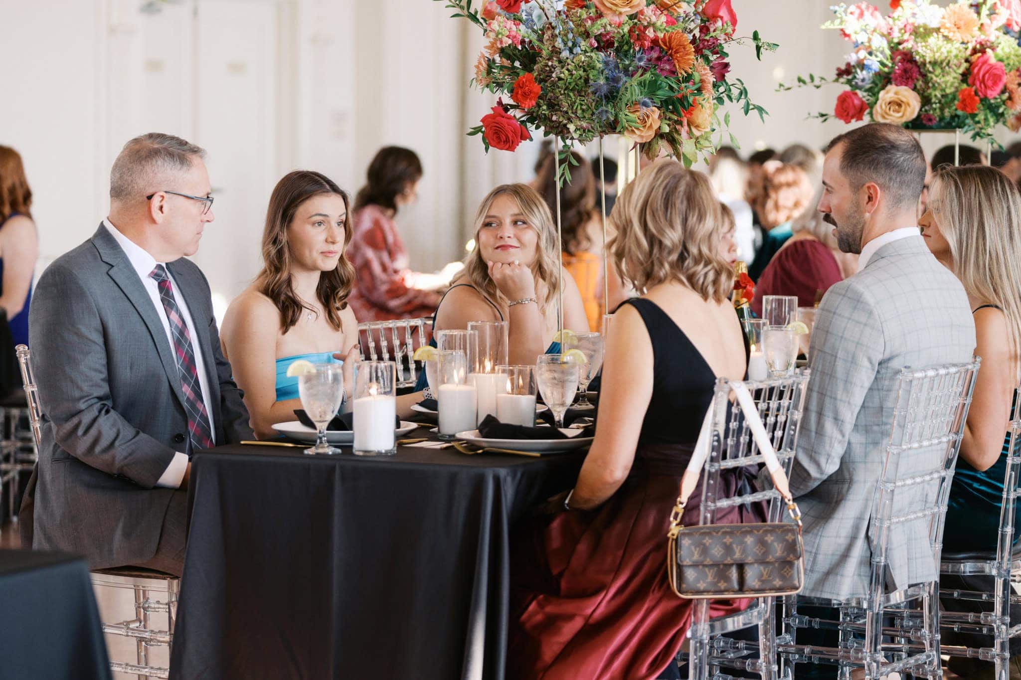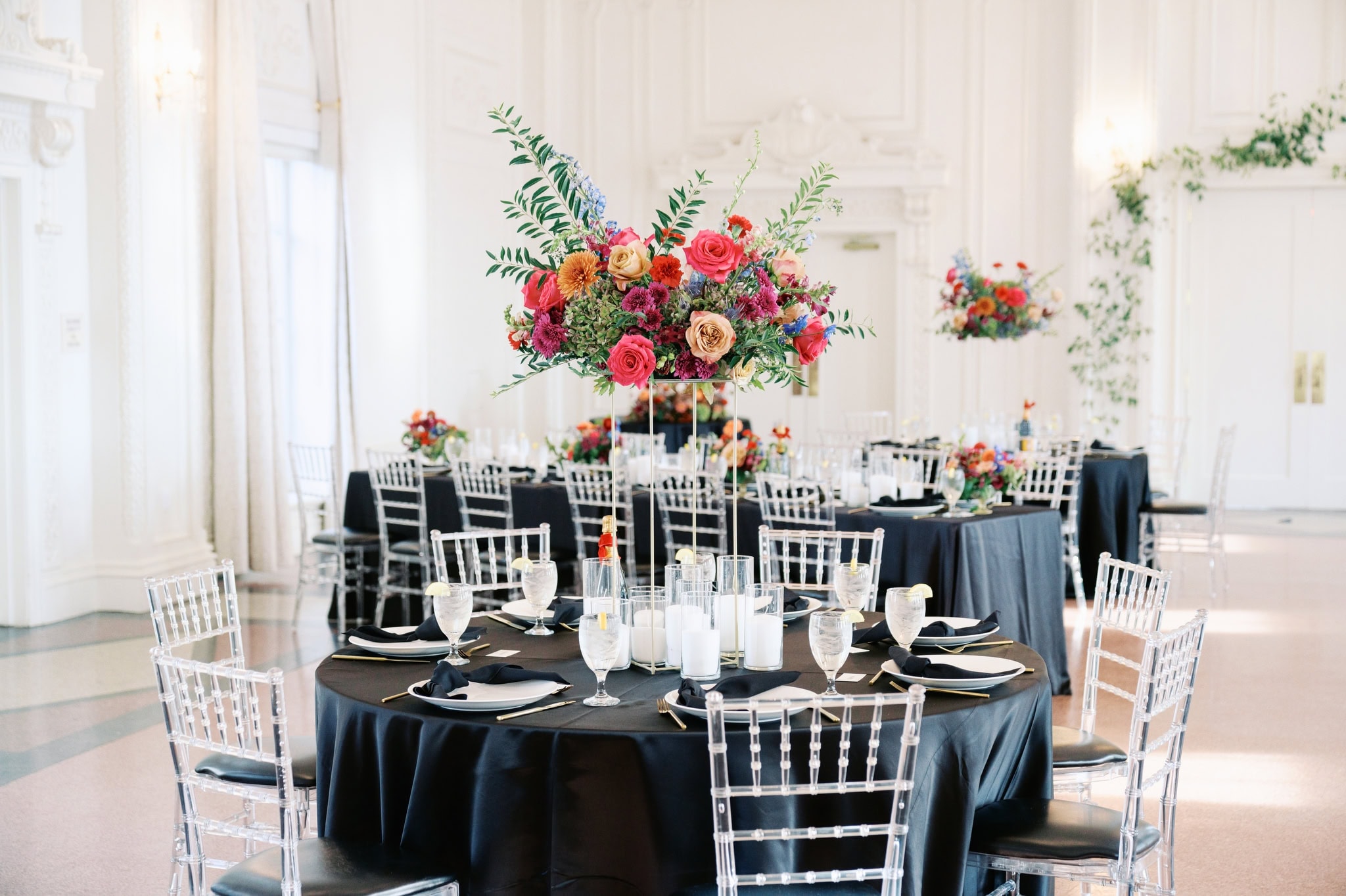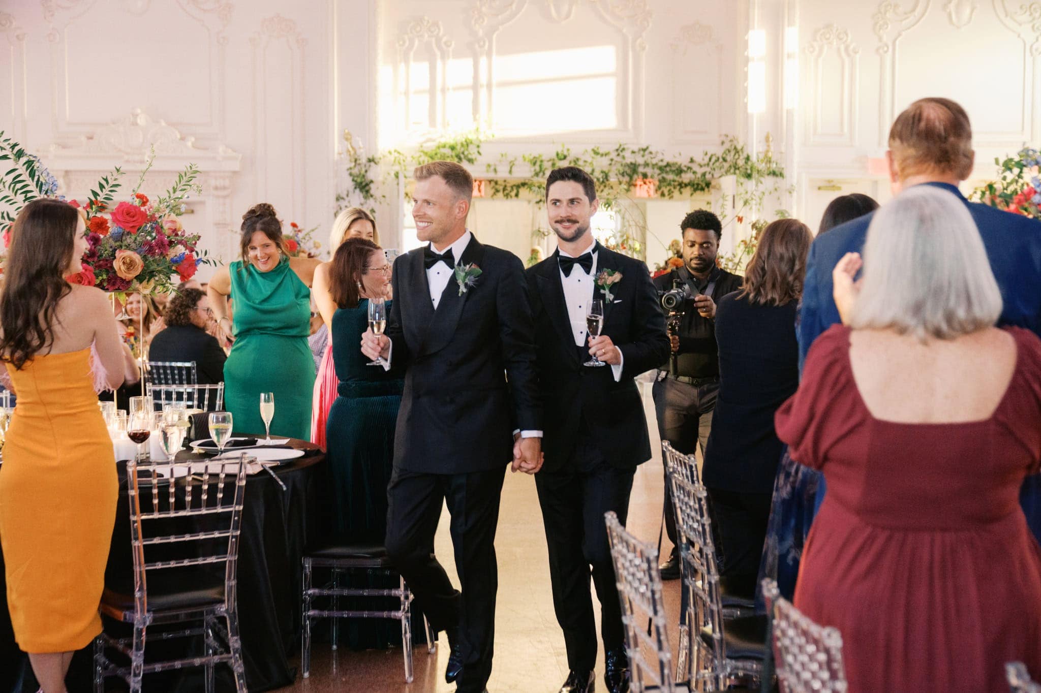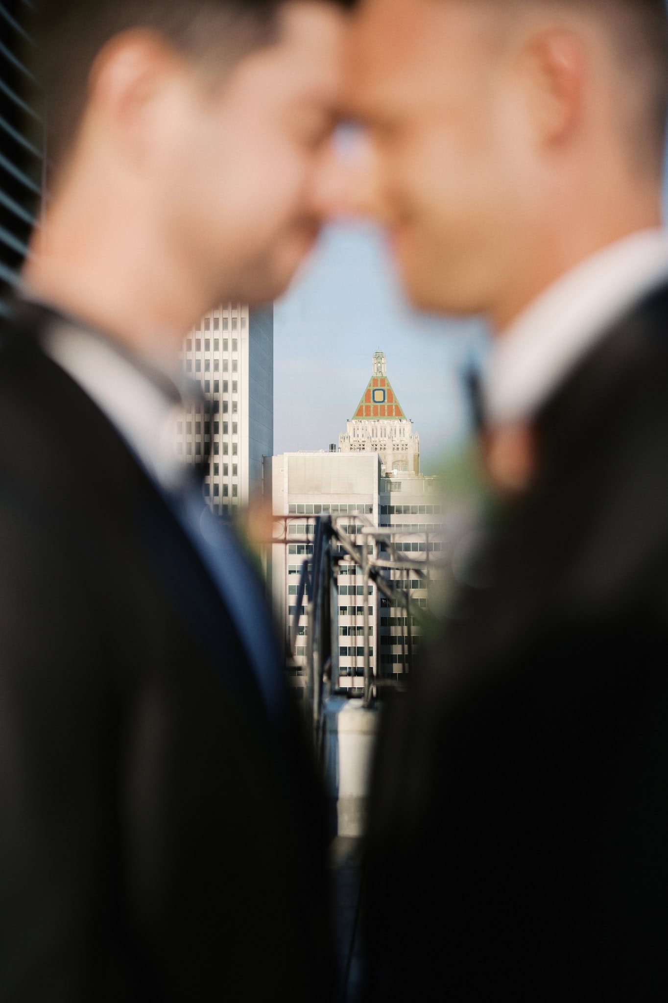 Guests were welcomed into The Mayo’s ballroom by the sound of a live string quartet, the notes echoing softly through the grand space. The room was a breathtaking blend of masculinity and romance with a clean black and white palette, softened by an abundance of florals that brought elegance and warmth to the celebration. Brett & Ryan chose not to have a wedding party, and that choice added a serene intimacy to the ceremony. Guests sat at their tables, watching with full hearts as the two exchanged vows surrounded by love. One of Brett and Ryan’s favorite moments came just after the ceremony, when they were whisked away to the rooftop for a moment alone. With the Tulsa skyline behind them and golden hour wrapping the city in light, they stood side by side, married at last. Literally on top of the world, and it was so well deserved.