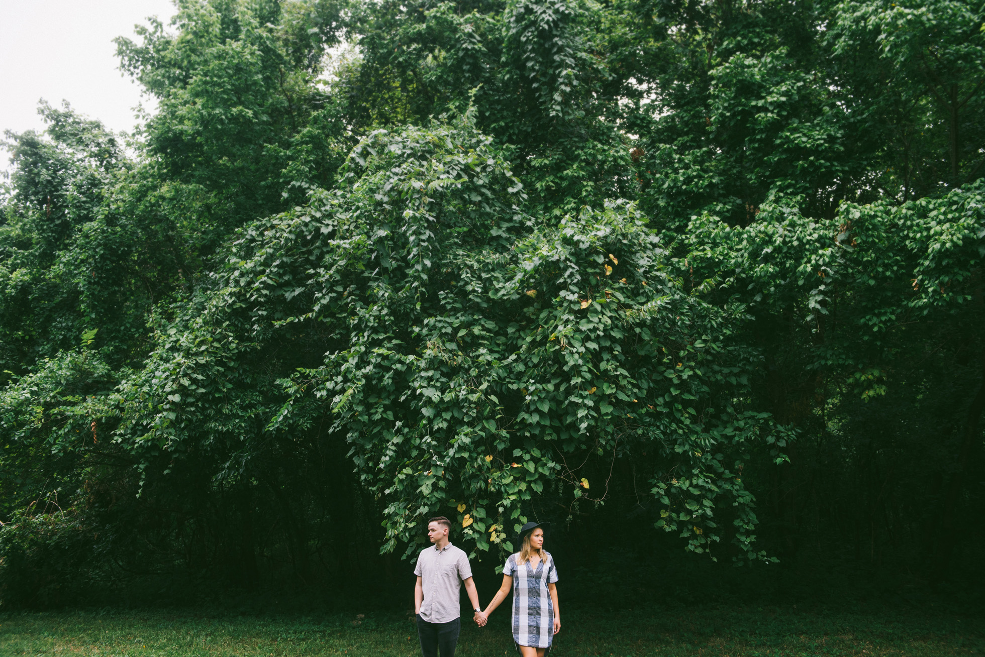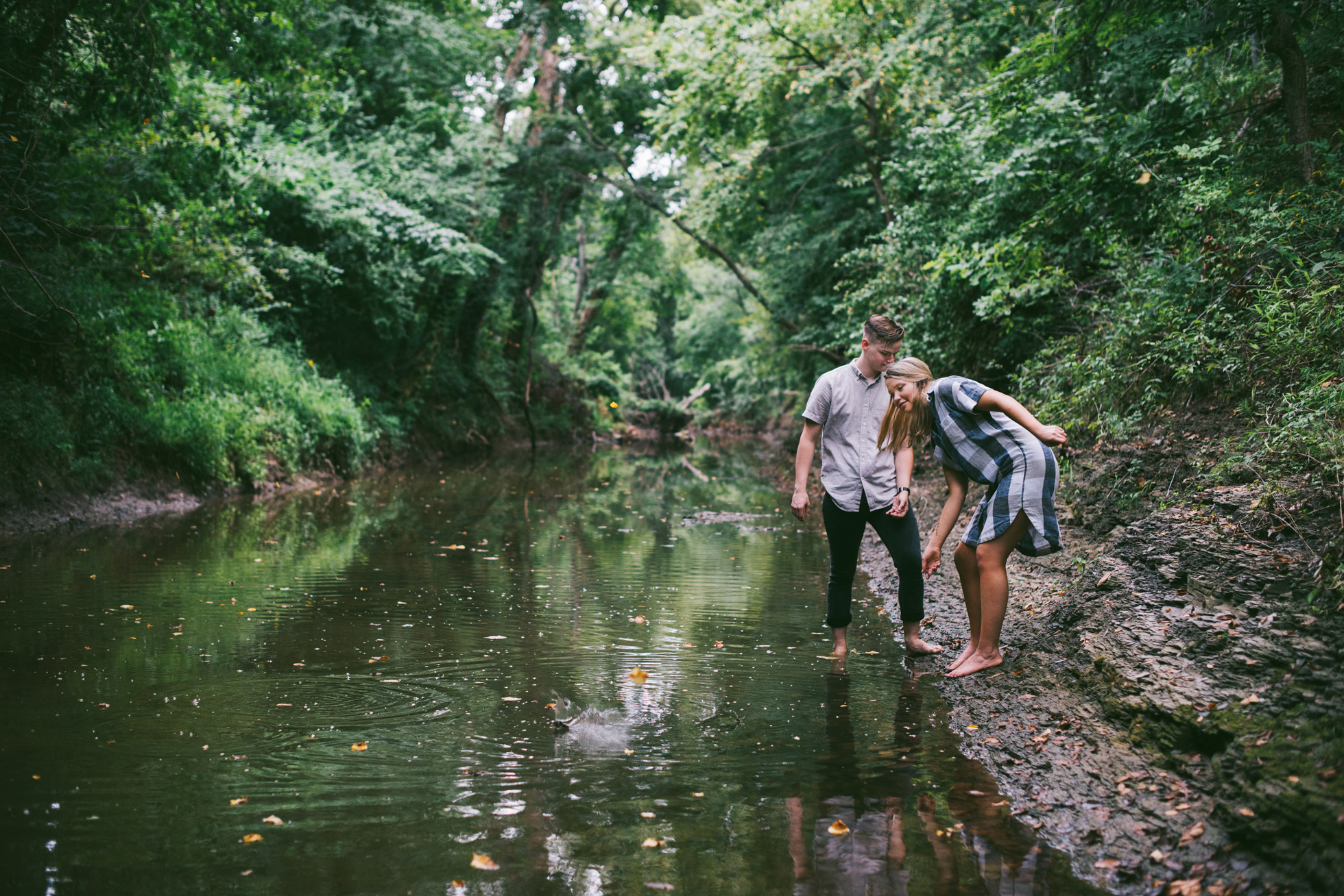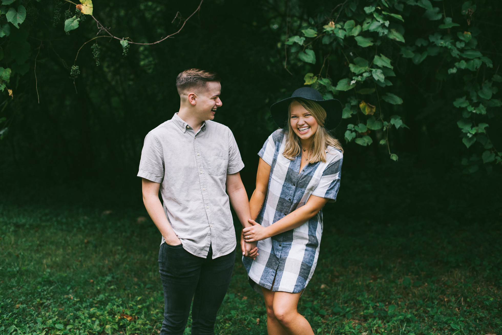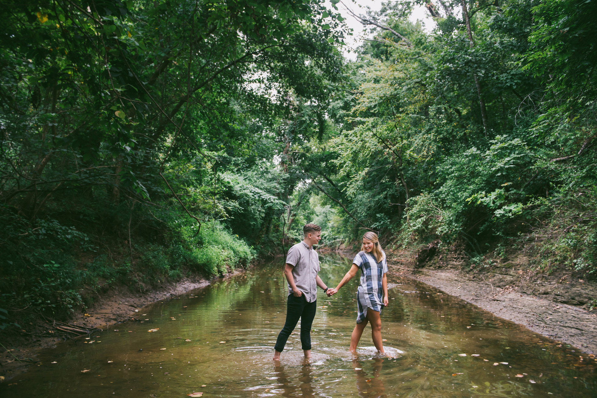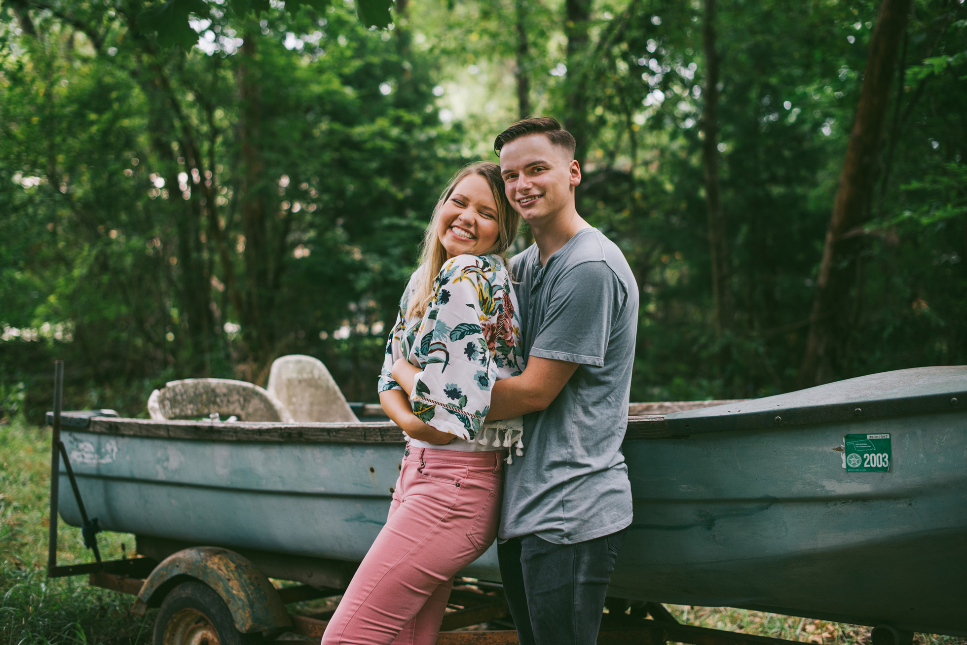 This wooded paradise is filled with childhood memories, summer love, towering trees, and a hidden creek. It was the perfect place to bring back memories and explore all over again for Kyler and Tess’ engagement session. The place, just outside of Tulsa, OK, is one of a kind. It’s actually Tess’ grandparents’ backyard where they spent many summer breaks together. The land is now an established forest overgrown with vines but her grandparents remember originally planting the trees years and years ago. No wonder this place is filled with so many fond memories and stories shared. Kyler & Tess are one of the most fun couples to hang out with. Kyler is pretty shy but funny with an inner punk waiting to break out. Tess is sweet but adventurous with a killer smile. You can see how much they love and care for each other when they are together, laughing at each other’s jokes or just strolling around enjoying each other’s company.