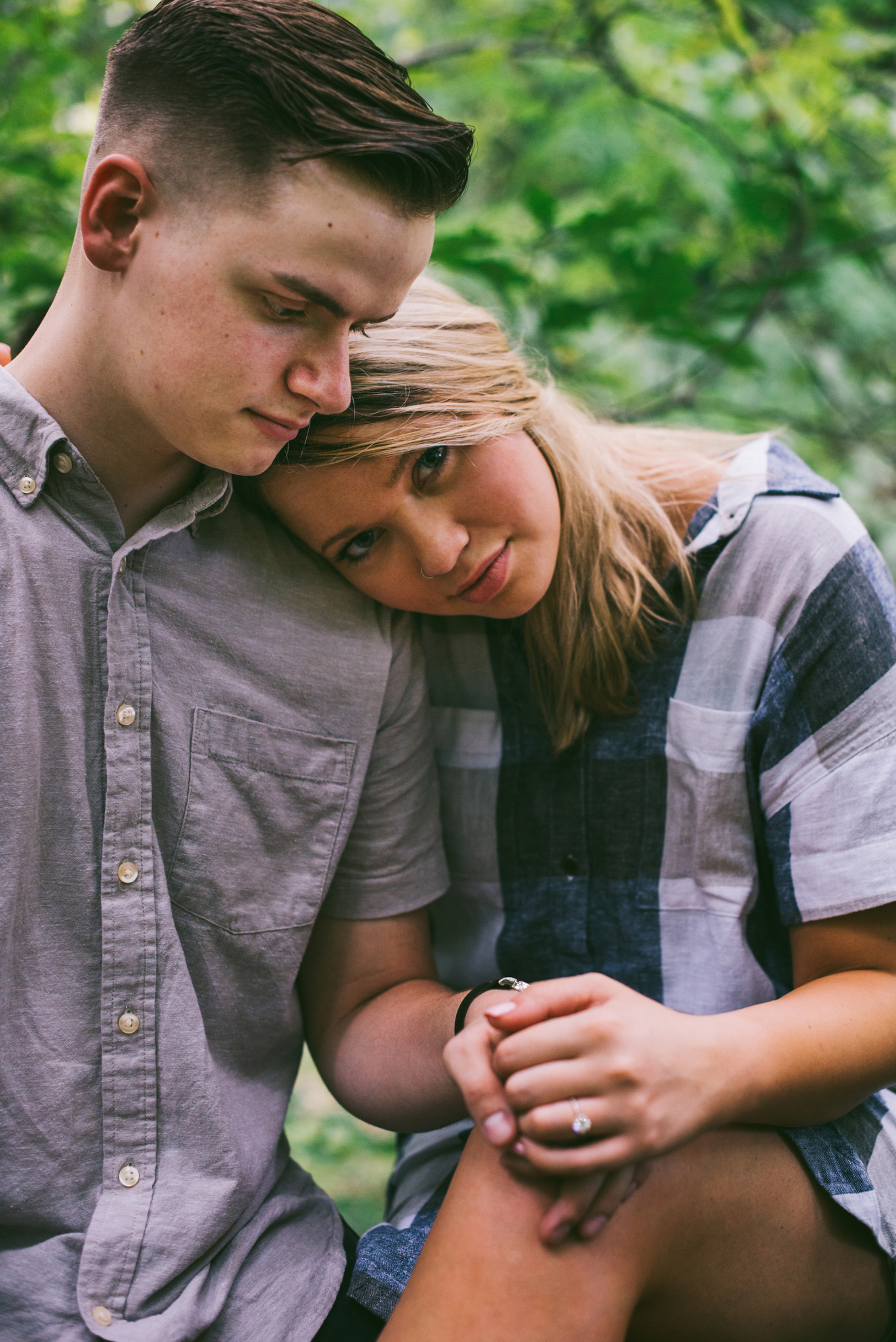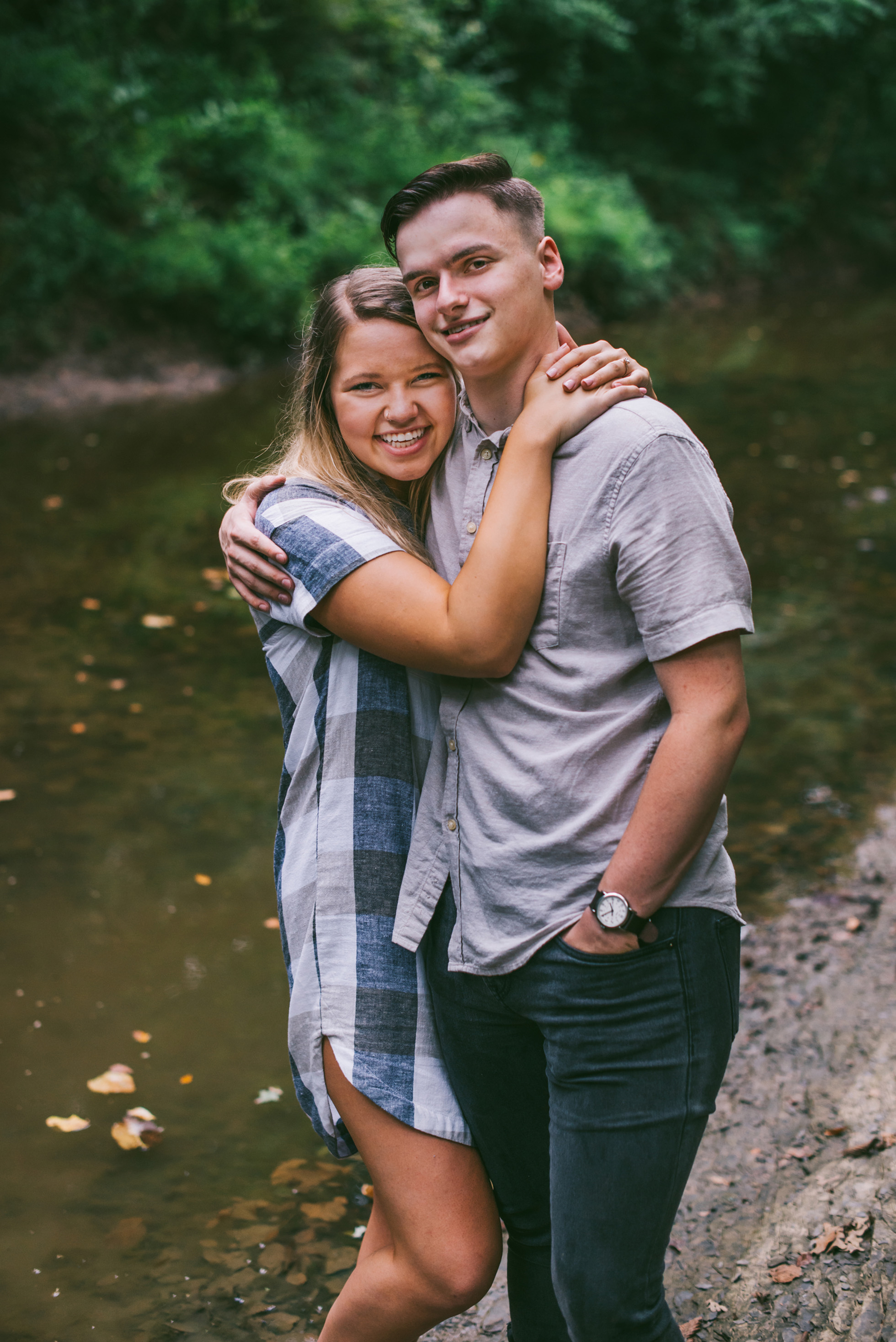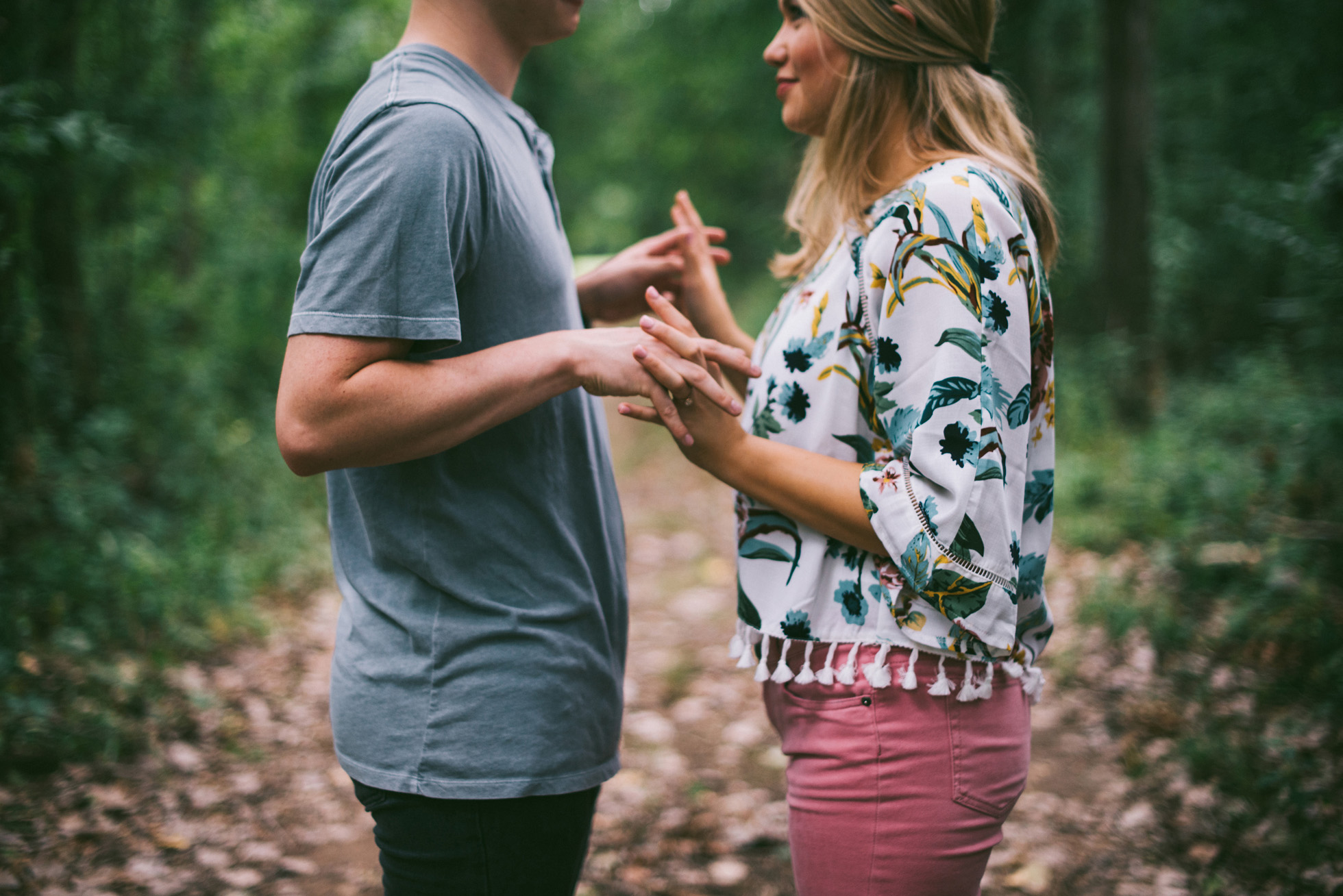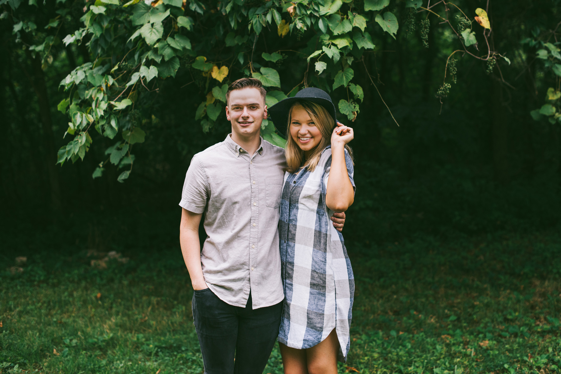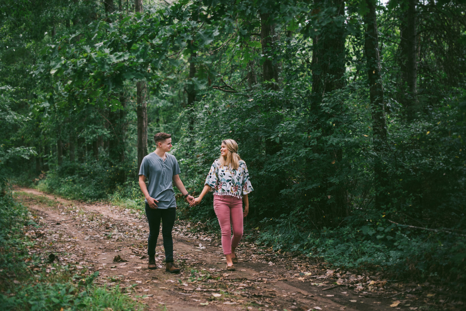 This wooded paradise is filled with childhood memories, summer love, towering trees, and a hidden creek. It was the perfect place to bring back memories and explore all over again for Kyler and Tess’ engagement session. The place, just outside of Tulsa, OK, is one of a kind. It’s actually Tess’ grandparents’ backyard where they spent many summer breaks together. The land is now an established forest overgrown with vines but her grandparents remember originally planting the trees years and years ago. No wonder this place is filled with so many fond memories and stories shared. Kyler & Tess are one of the most fun couples to hang out with. Kyler is pretty shy but funny with an inner punk waiting to break out. Tess is sweet but adventurous with a killer smile. You can see how much they love and care for each other when they are together, laughing at each other’s jokes or just strolling around enjoying each other’s company.