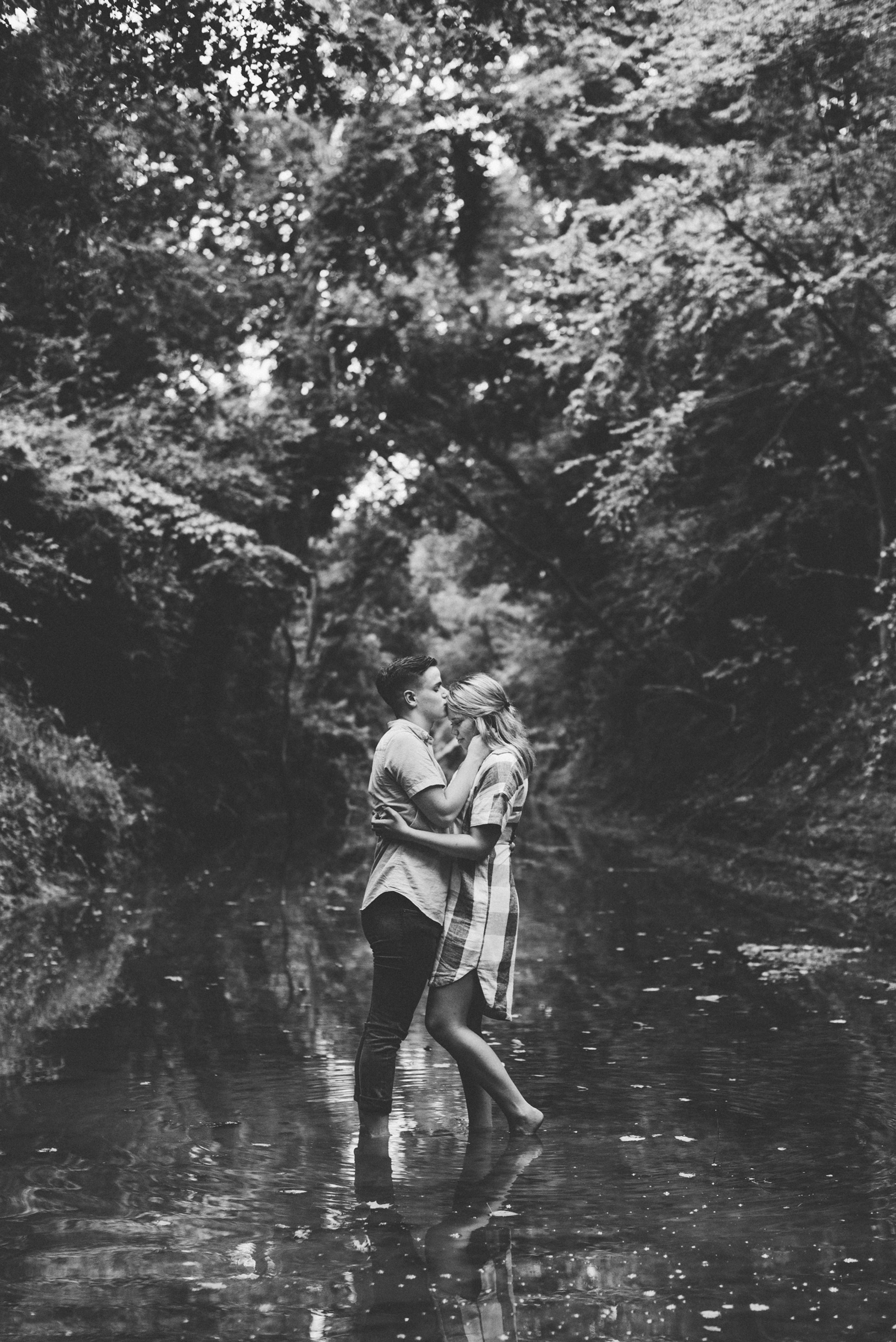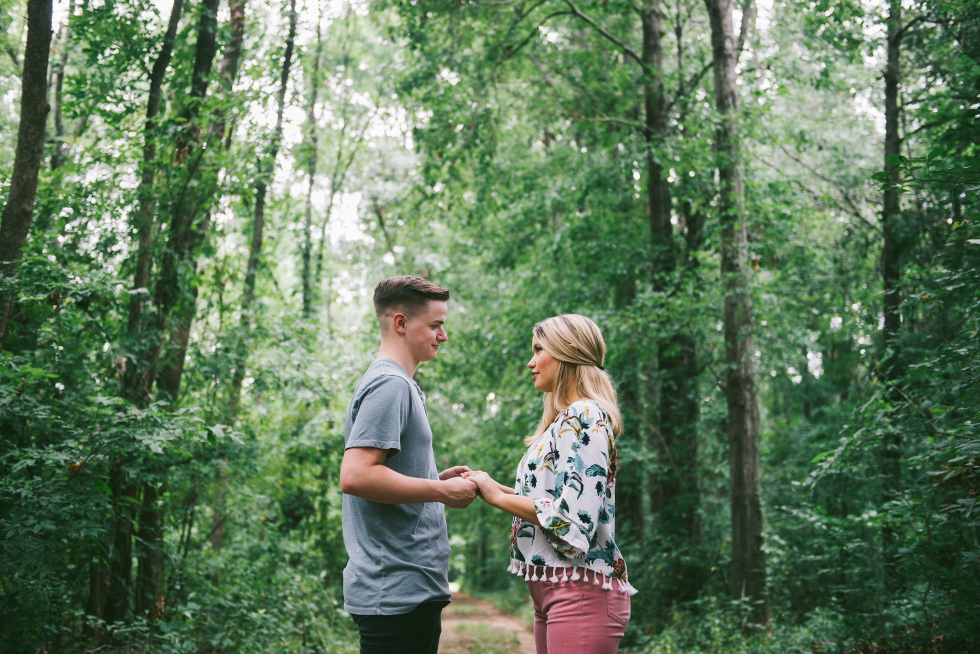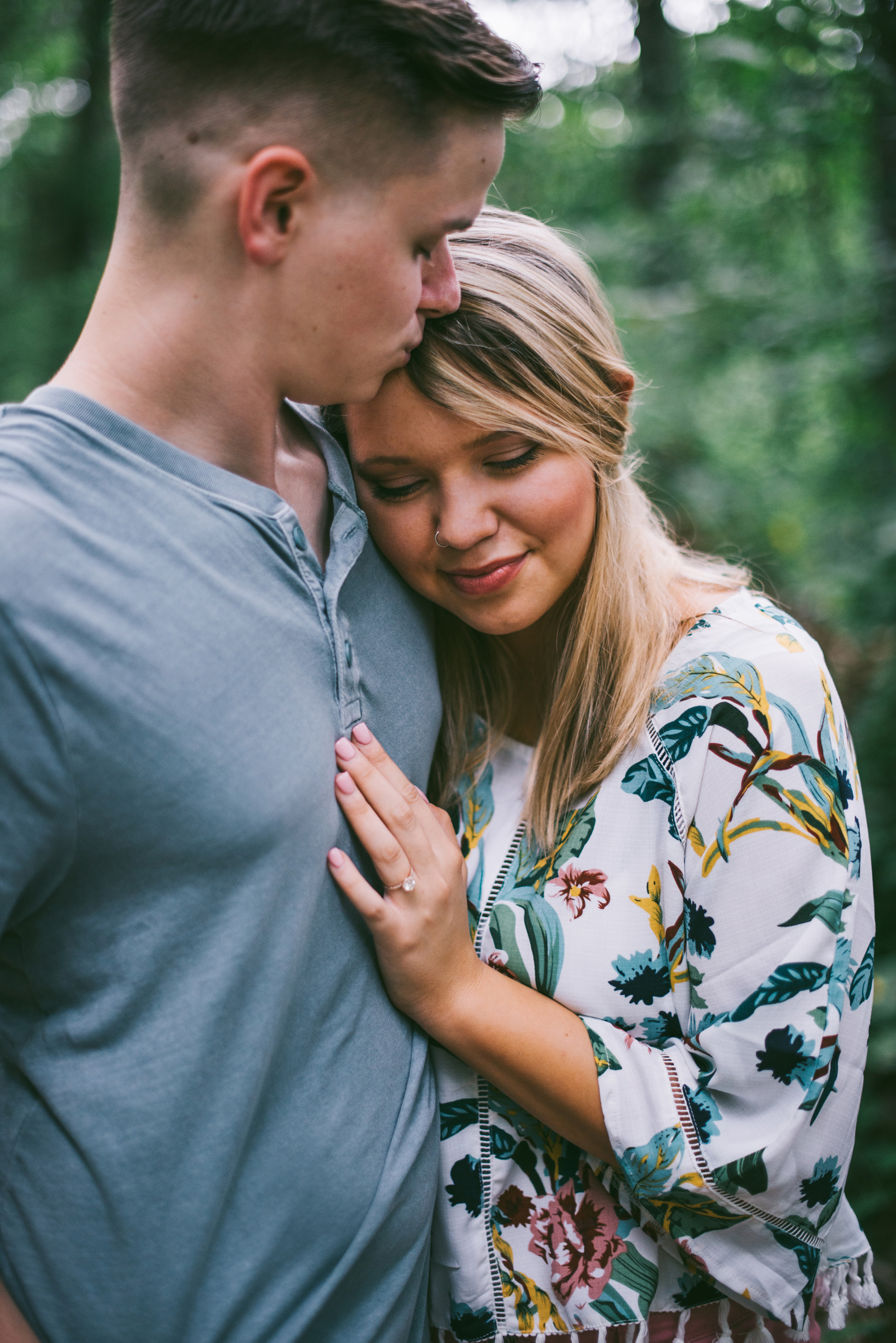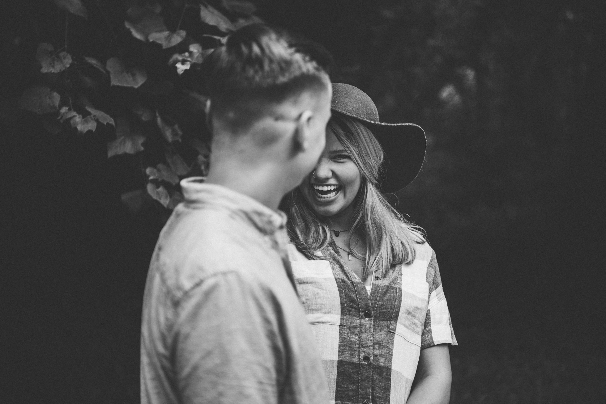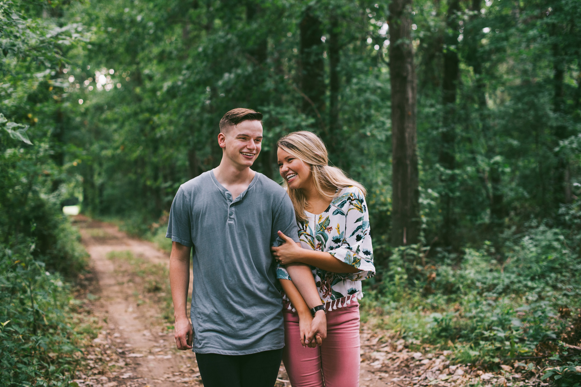 This wooded paradise is filled with childhood memories, summer love, towering trees, and a hidden creek. It was the perfect place to bring back memories and explore all over again for Kyler and Tess’ engagement session. The place, just outside of Tulsa, OK, is one of a kind. It’s actually Tess’ grandparents’ backyard where they spent many summer breaks together. The land is now an established forest overgrown with vines but her grandparents remember originally planting the trees years and years ago. No wonder this place is filled with so many fond memories and stories shared. Kyler & Tess are one of the most fun couples to hang out with. Kyler is pretty shy but funny with an inner punk waiting to break out. Tess is sweet but adventurous with a killer smile. You can see how much they love and care for each other when they are together, laughing at each other’s jokes or just strolling around enjoying each other’s company.