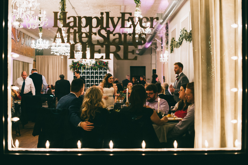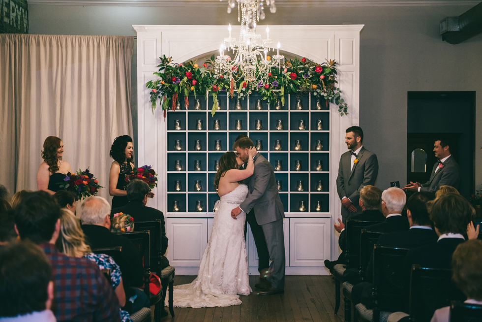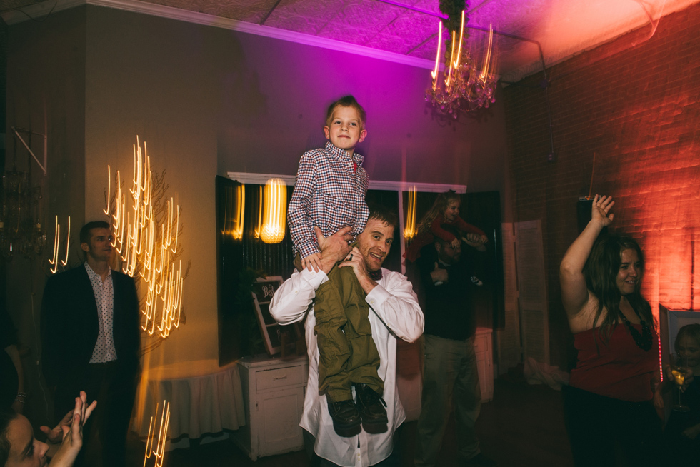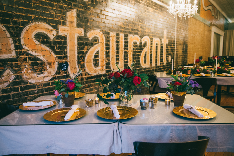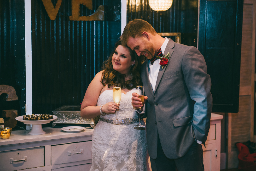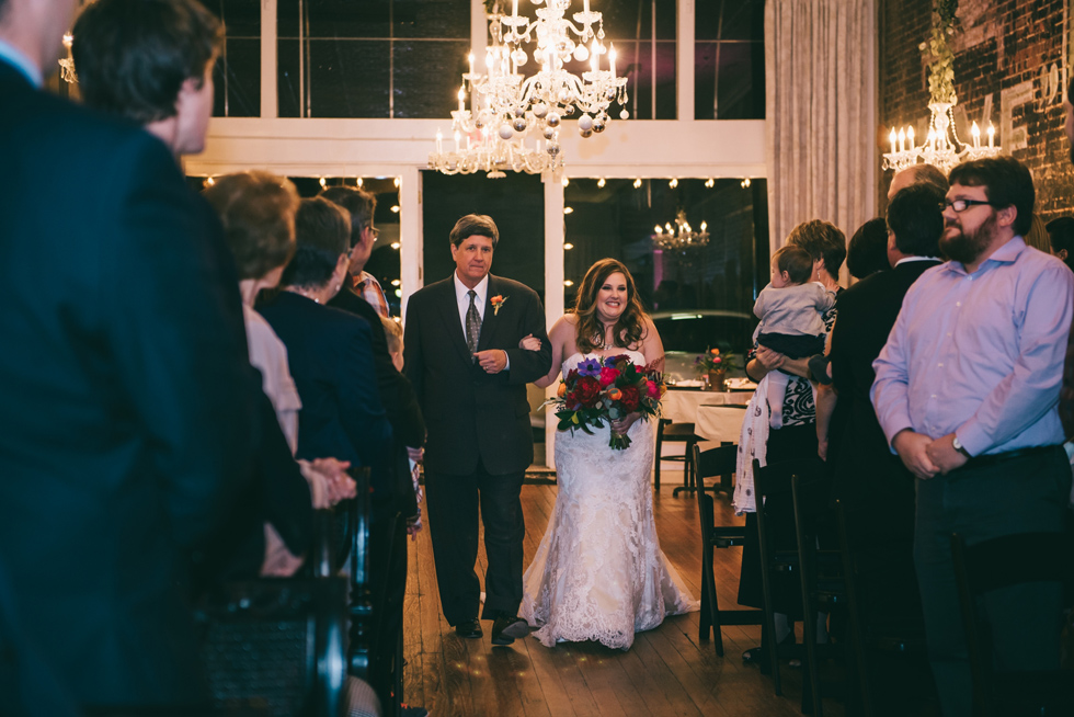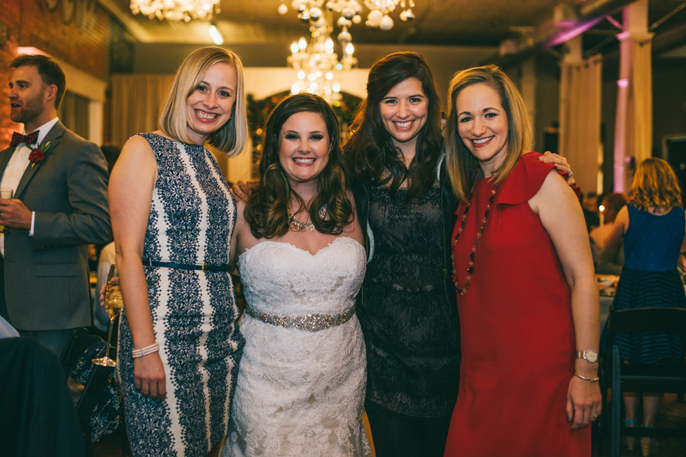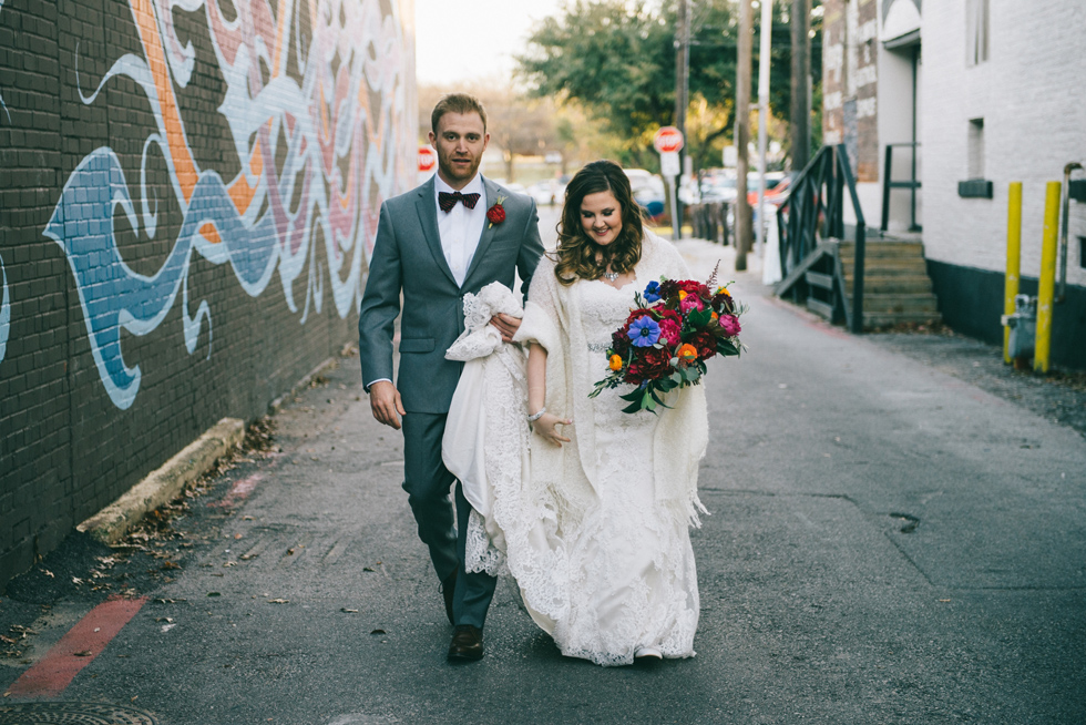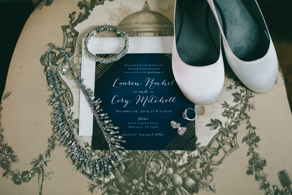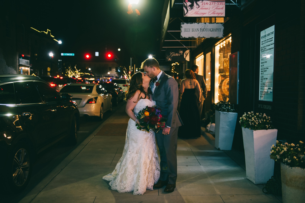 It was our first time to McKinney, TX and we quickly discovered that it is a very special town. It’s just outside of Dallas but it is its own little world. Cory and Lauren got married at Gather in the heart of downtown McKinney. The downtown is exactly what you’d always hope a downtown could be. With Christmas around the corner, the sidewalks were full of windows shoppers popping in and out of specialty shops. At night it stays alive with Christmas carolers on the corner. Their wedding was even more amazing and perfectly fit this storybook town. Stepping into the venue, the atmosphere of the town follows you in with exposed brick walls and lots of chandeliers. I love the jewel tone colours Lauren chose, the rustic details, and all the old world charm. Everything was so pretty! The most beautiful part of the wedding was Cory and Lauren. You could see the excitement on their faces and all the love. Lauren looked so radiant. I love her dress and she had the most gorgeous bouquet. All the floral arrangements at their wedding were amazing. The wedding was a soiree of their closest friends and family and many people came from out of town to celebrate. Cory and Lauren both were so laid back and relaxed the entire time. It was truly a day full of heart and fun.