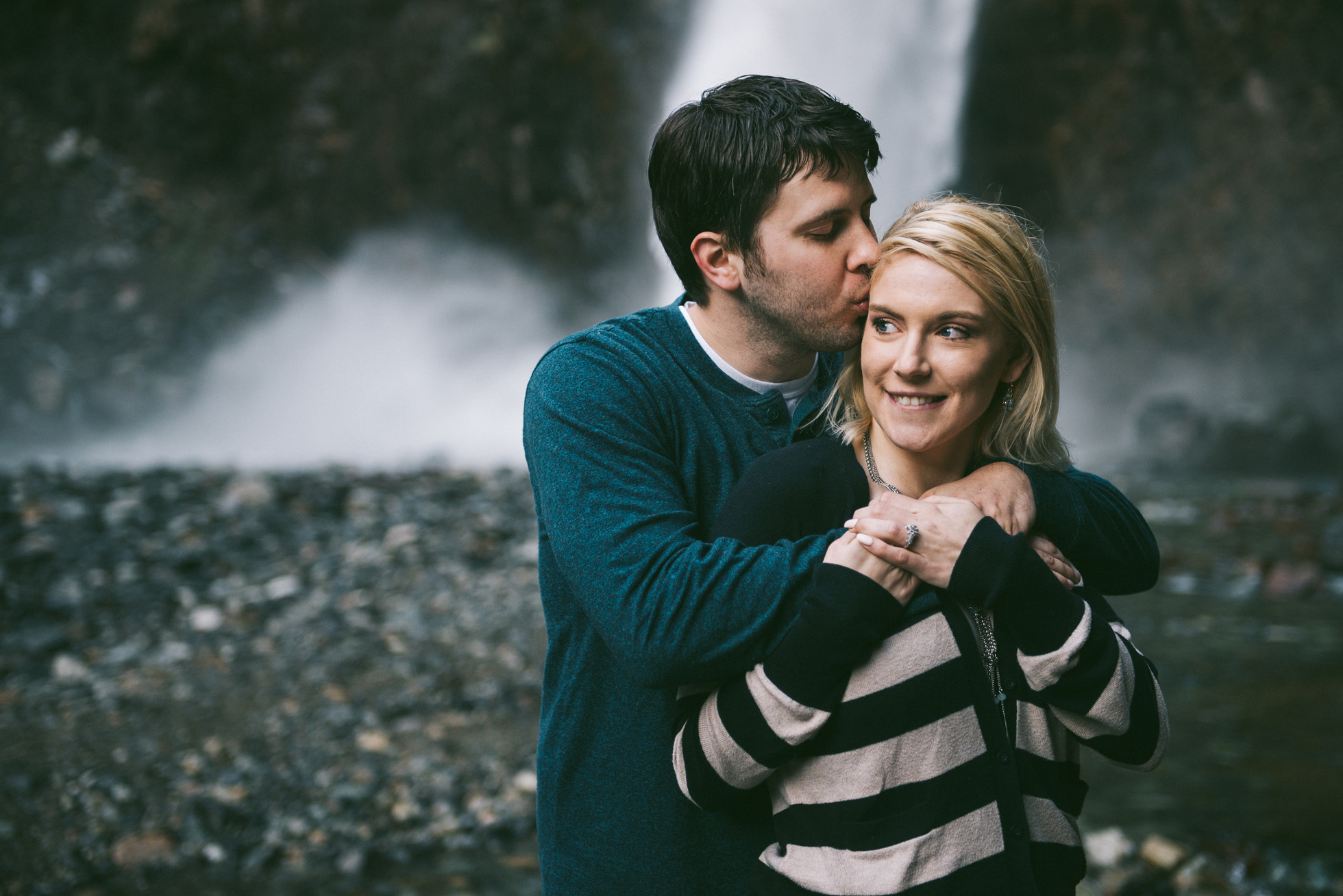 On our recent trip to the Pacific Northwest, we ventured out to the Snoqualmie Pass area just outside of Seattle, Washington. It was well into spring but driving up into the mountains you could still see snow on the sides of the roads. And in some areas, the roads were not even passable with fallen trees that had not yet been cleared from the winter storms. It was truly an adventure into the wilderness. Everywhere you turn the views are breathtaking, but the love between James and Shannon is even more beautiful. For their engagement session, we hiked beneath the tall evergreens along the raging Snoqualmie River. They love spending time together in the outdoors and are madly in love. They are an easy-going couple and are so much fun to be around with. Upon viewing the majestic waterfalls at the end of the trail, the adventure was all worth it.