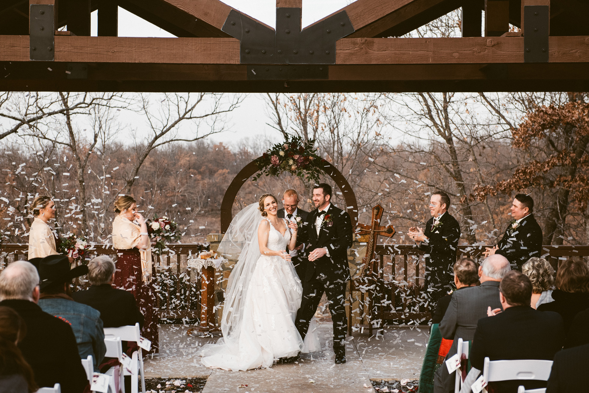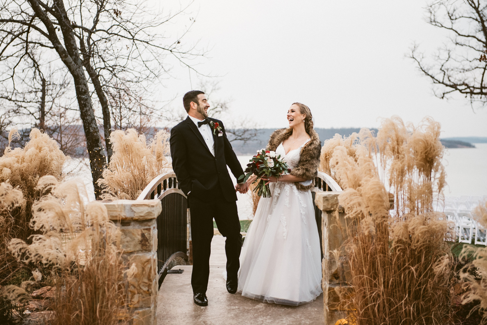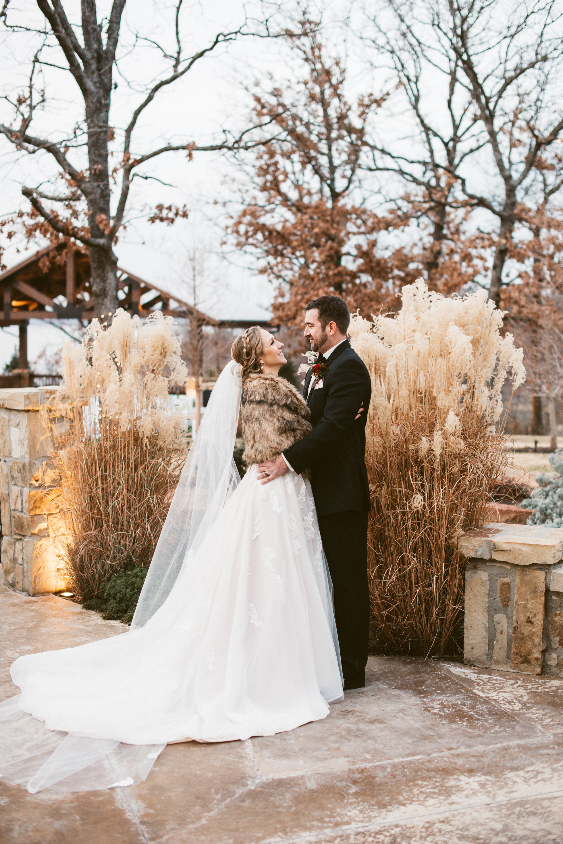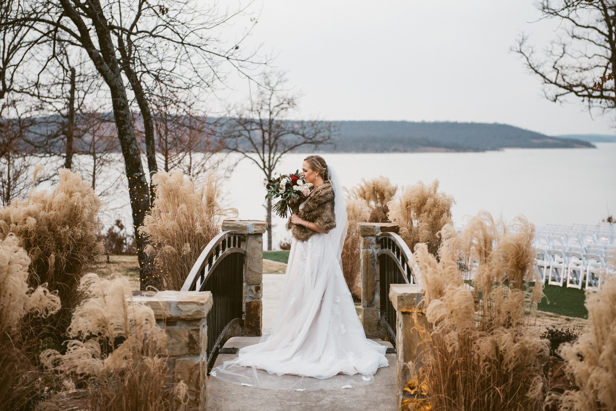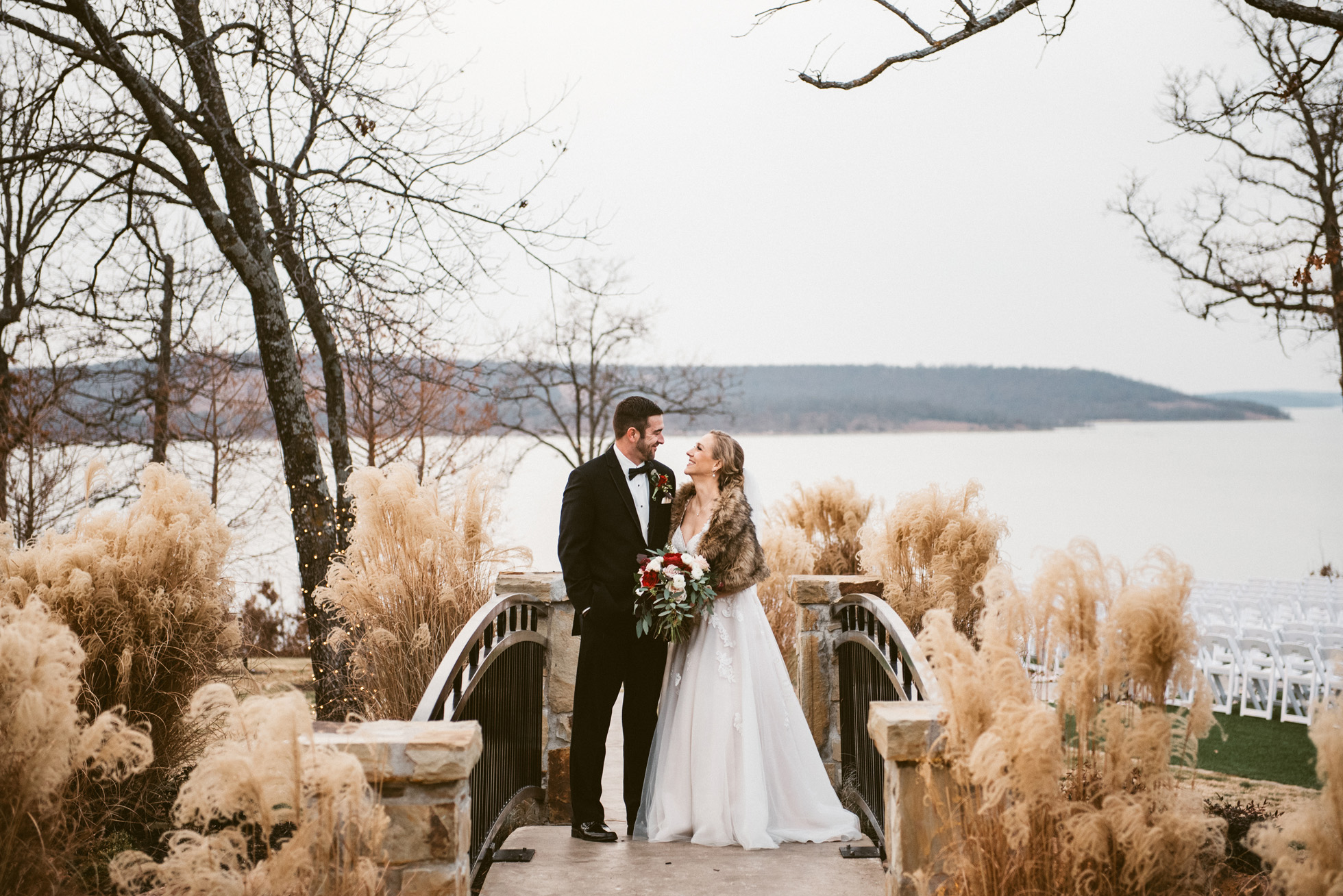 I’ll come out and say it, it was cold! But looking back over the photos, you would think it was a beautiful day…because it was! Jody and Amanda wanted to have a winter wedding so the weather was no surprise. As their big day started, I will never forget all the feels during Amanda’s first look with her Dad. Watching the proud look on his face, and off to the side, her mom welling up with happy tears. Truly, I can’t get enough of this lovely winter wedding. It was cold, freezing, and windy by Skiatook Lake that day even with the bright sun. But there was Amanda, excited, all smiles, exuding joy, and Jody was stoic and handsome as ever. Jody had proposed to Amanda on a hiking trip through Galcier National Park. They are a brave and well travelled couple. So I knew they would be up for anything. The guests cautiously headed outside, snatching a blanket wedding favor along the way. And everyone will forever remember the fun burst of confetti and excitement during this gorgeous couple’s first kiss. They watched the sun set softly over the lake while trying to keep warm with Amanda’s fur wrap and each other’s embrace. The Springs Event Venue in Tulsa, OK was gorgeous! The water bubbling through the ice encrusted stream, and the bridge fringed with pampas grass set against the lakeside backdrop was totally picturesque. The elegant affair was quickly turned into a colorful dance party. Glow sticks danced in the air as a large Love marquee sparkled in the background. The couple was sent off to their next adventure with cheers and of course…more confetti!