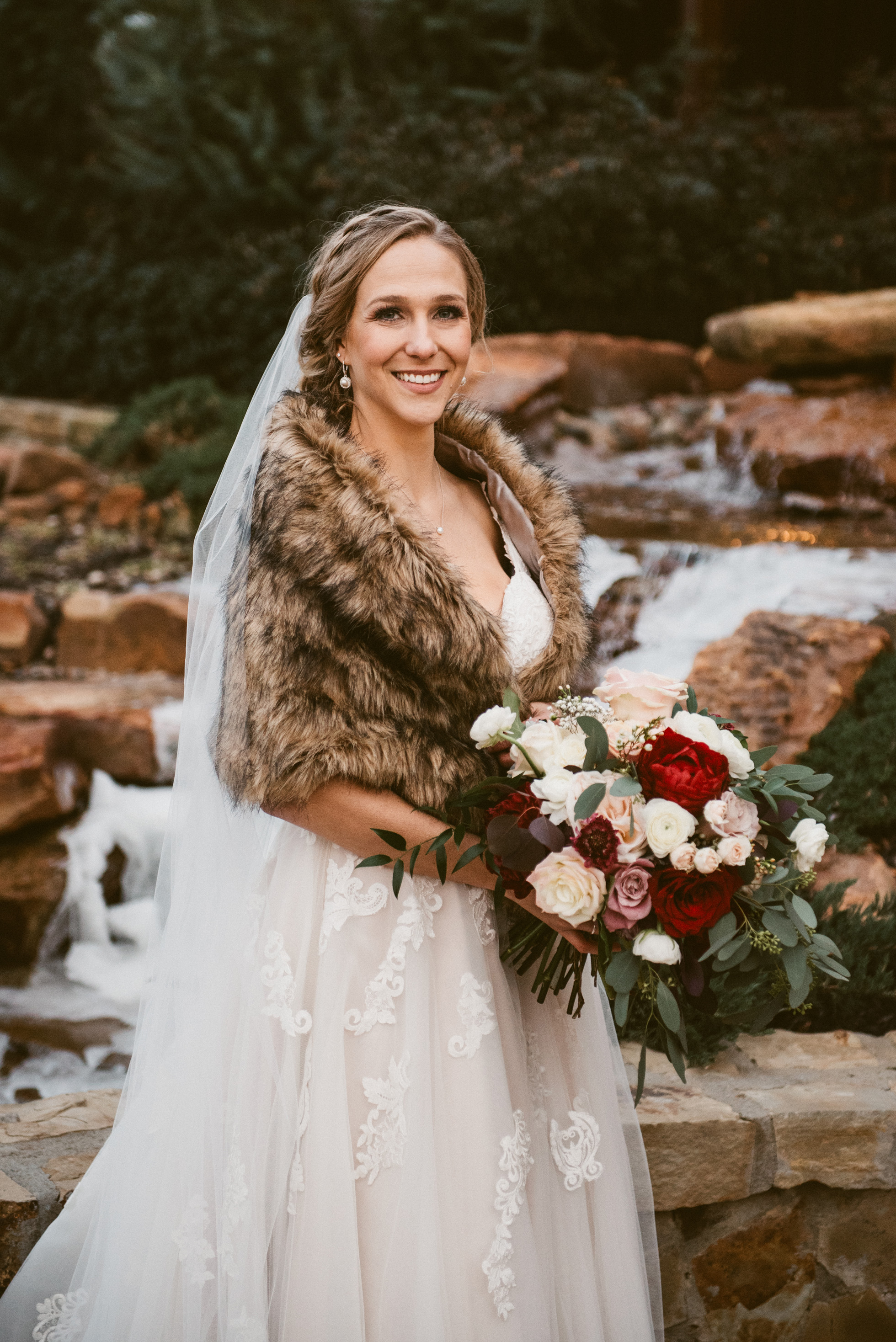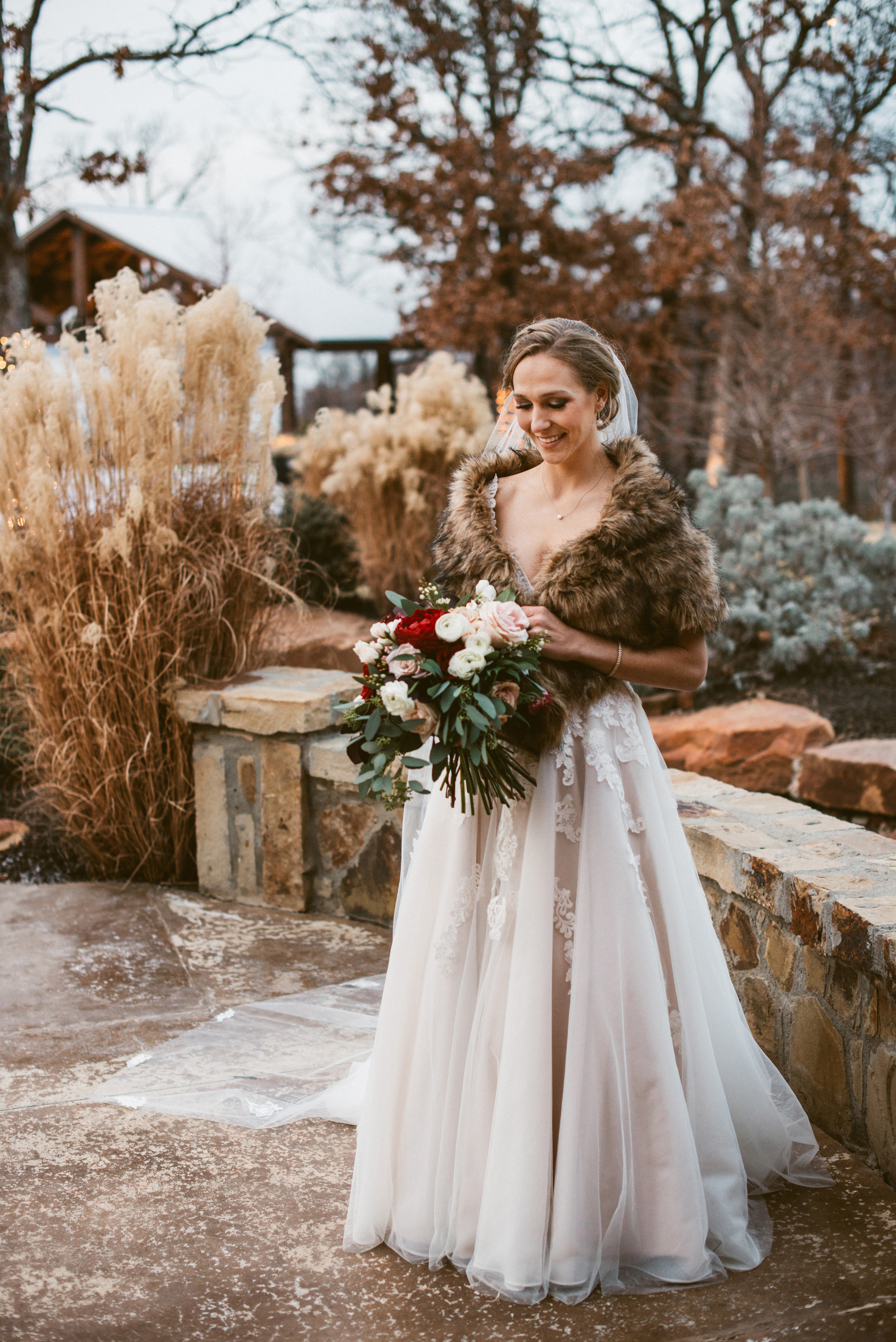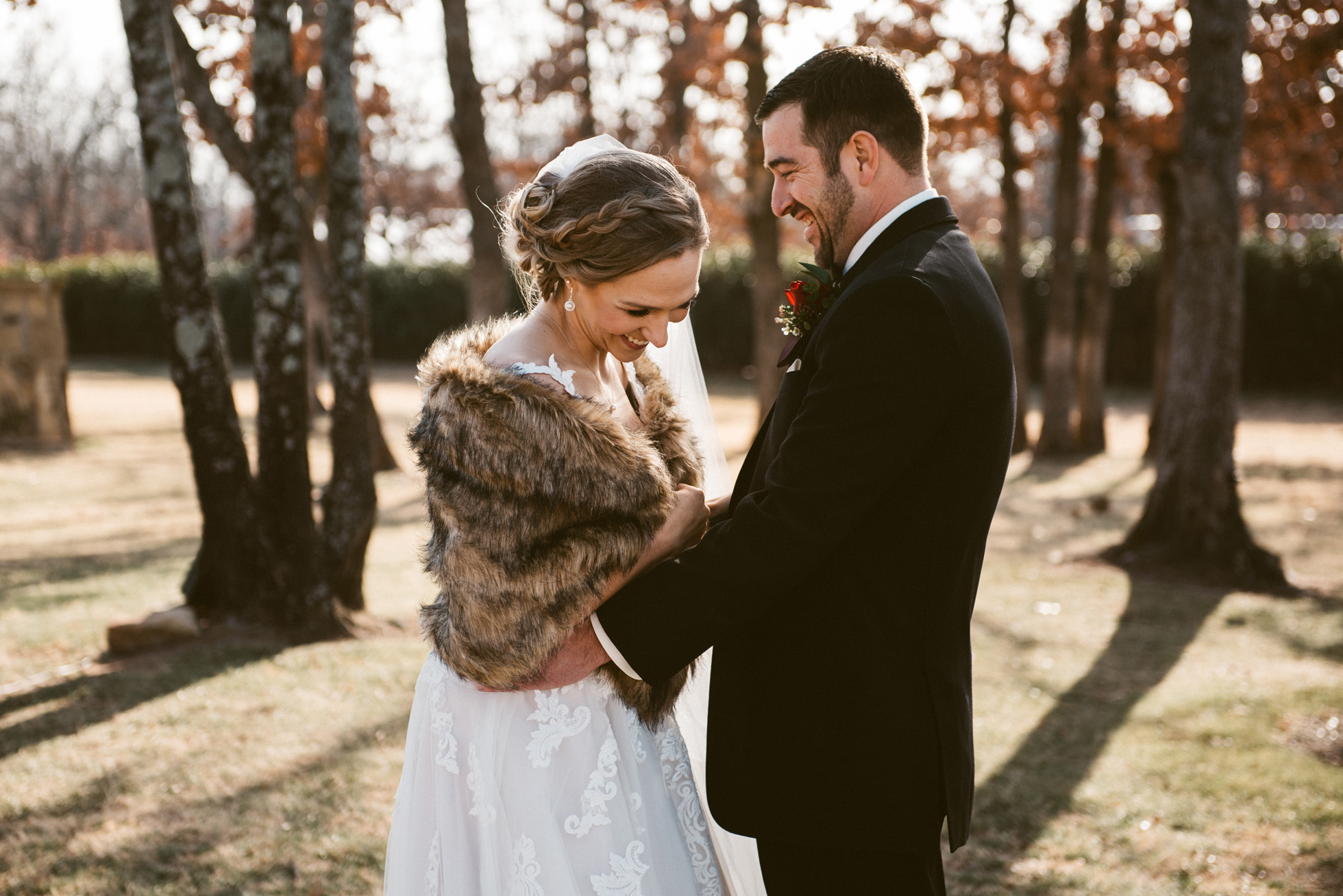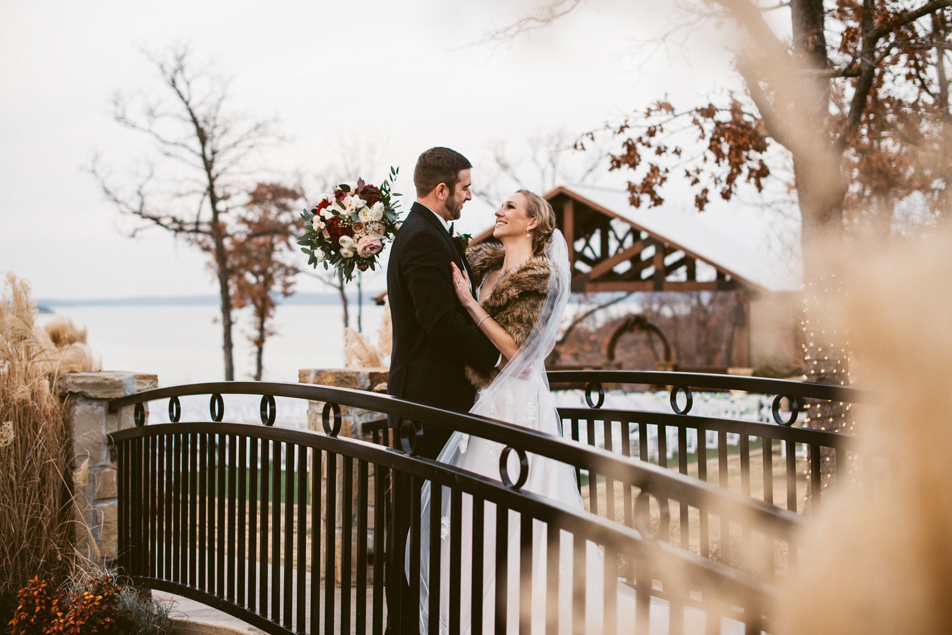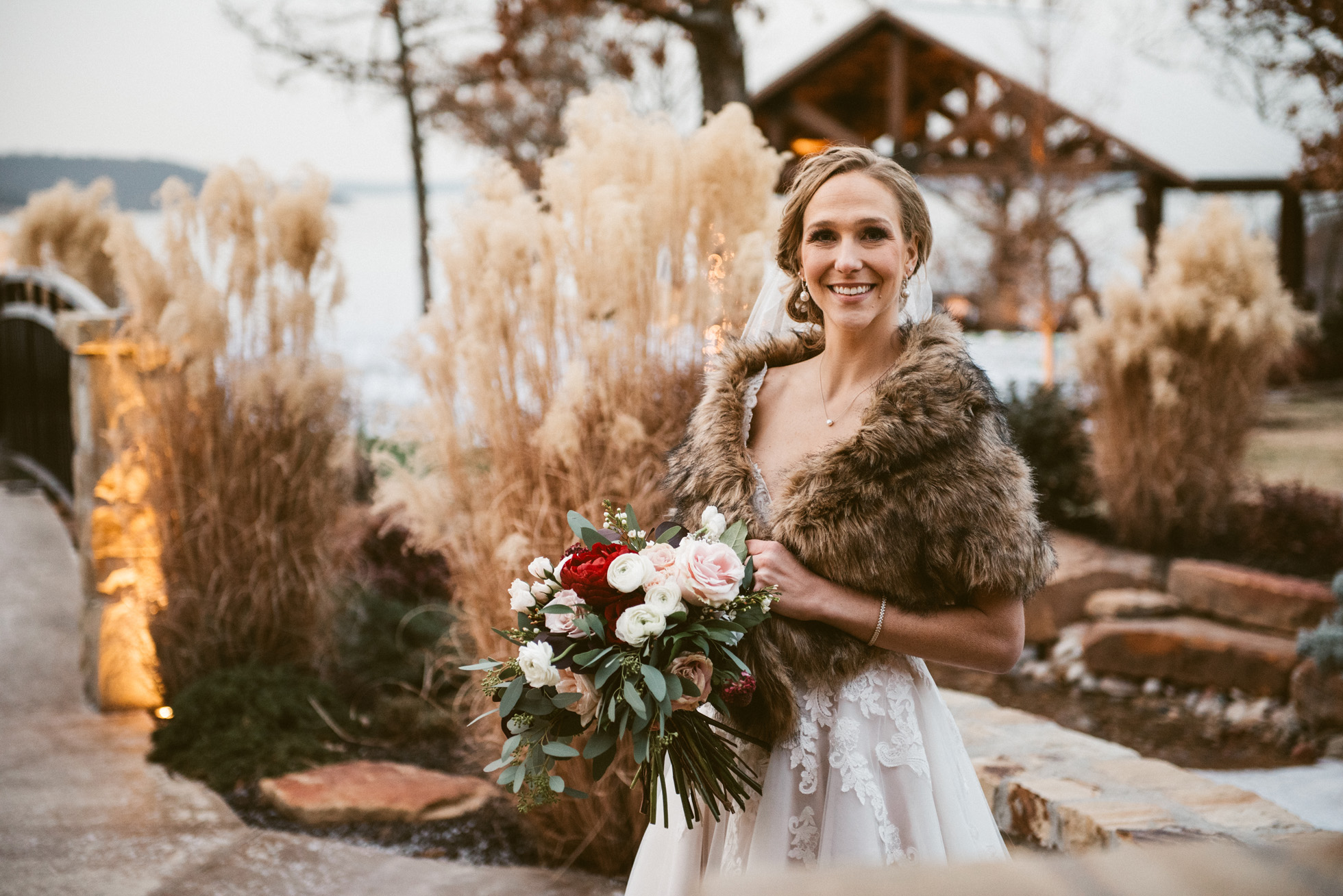 I’ll come out and say it, it was cold! But looking back over the photos, you would think it was a beautiful day…because it was! Jody and Amanda wanted to have a winter wedding so the weather was no surprise. As their big day started, I will never forget all the feels during Amanda’s first look with her Dad. Watching the proud look on his face, and off to the side, her mom welling up with happy tears. Truly, I can’t get enough of this lovely winter wedding. It was cold, freezing, and windy by Skiatook Lake that day even with the bright sun. But there was Amanda, excited, all smiles, exuding joy, and Jody was stoic and handsome as ever. Jody had proposed to Amanda on a hiking trip through Galcier National Park. They are a brave and well travelled couple. So I knew they would be up for anything. The guests cautiously headed outside, snatching a blanket wedding favor along the way. And everyone will forever remember the fun burst of confetti and excitement during this gorgeous couple’s first kiss. They watched the sun set softly over the lake while trying to keep warm with Amanda’s fur wrap and each other’s embrace. The Springs Event Venue in Tulsa, OK was gorgeous! The water bubbling through the ice encrusted stream, and the bridge fringed with pampas grass set against the lakeside backdrop was totally picturesque. The elegant affair was quickly turned into a colorful dance party. Glow sticks danced in the air as a large Love marquee sparkled in the background. The couple was sent off to their next adventure with cheers and of course…more confetti!