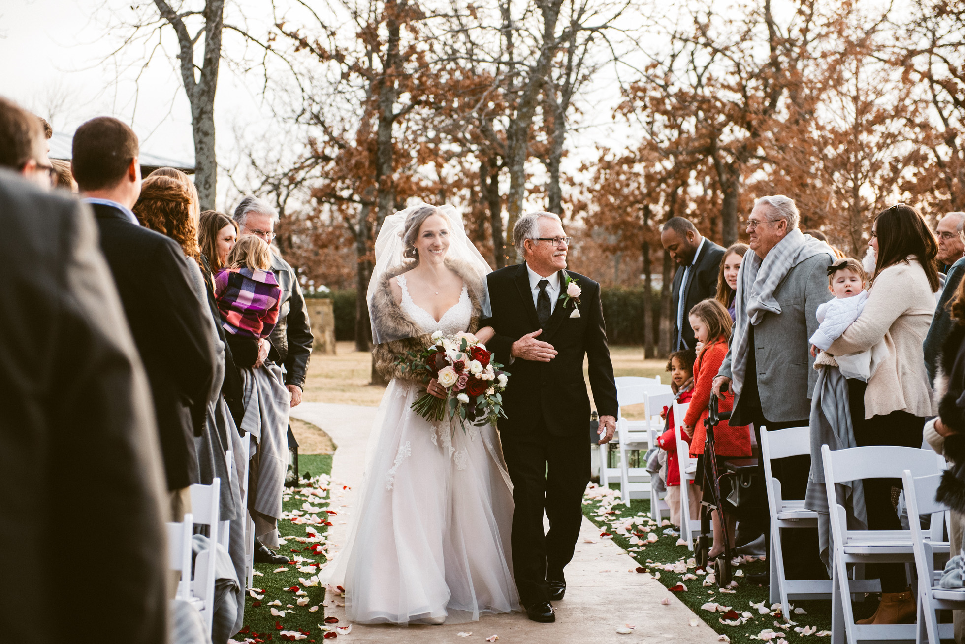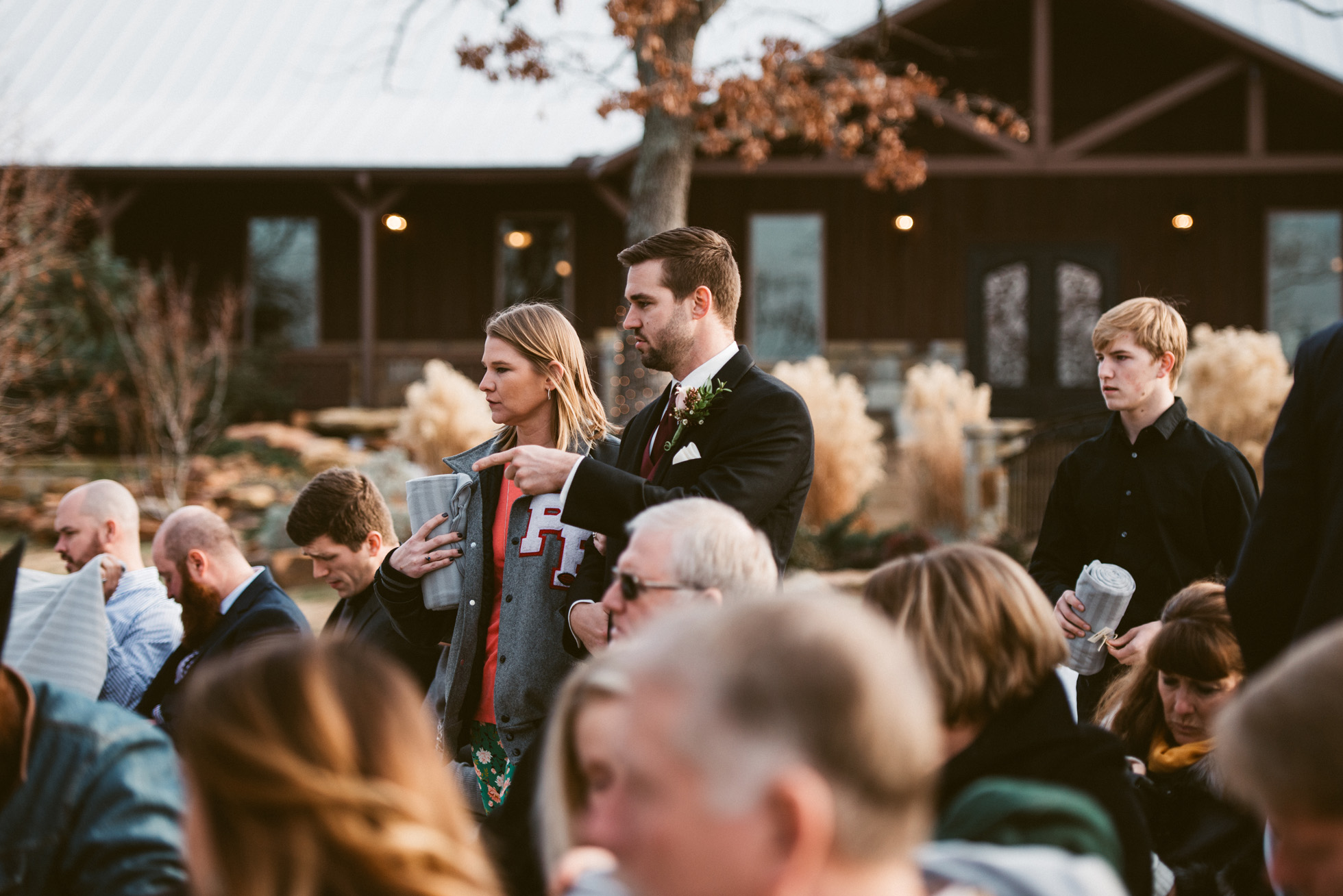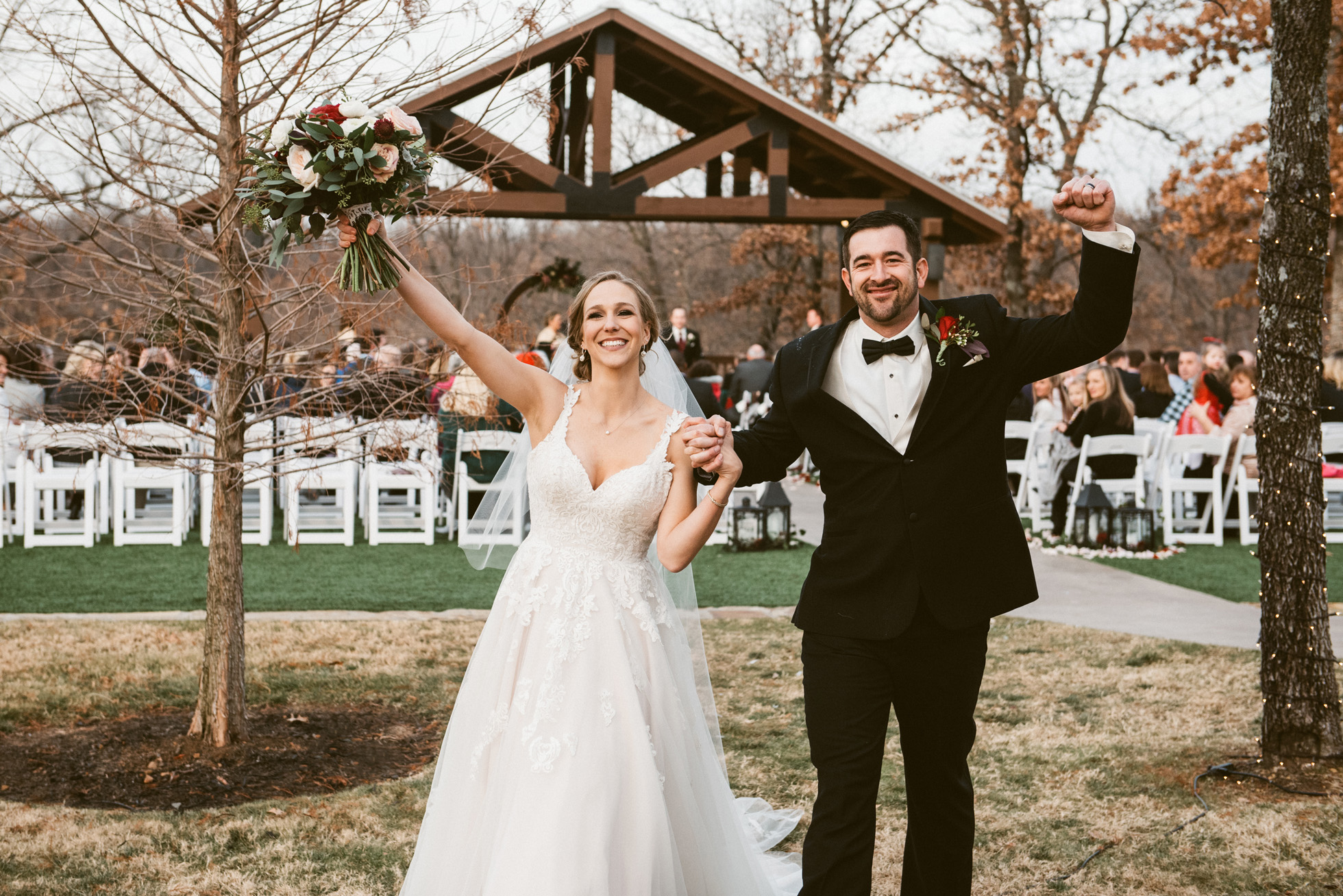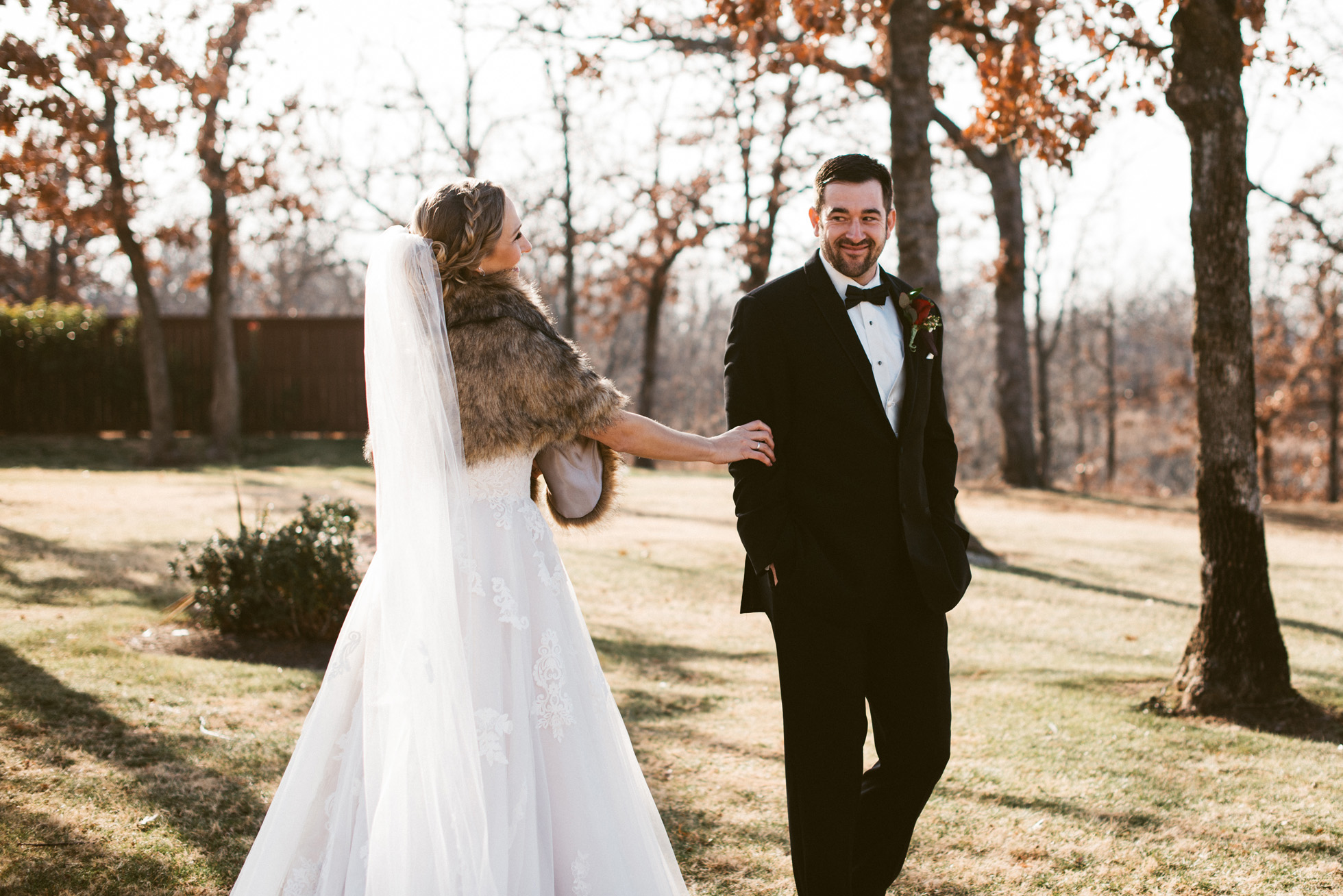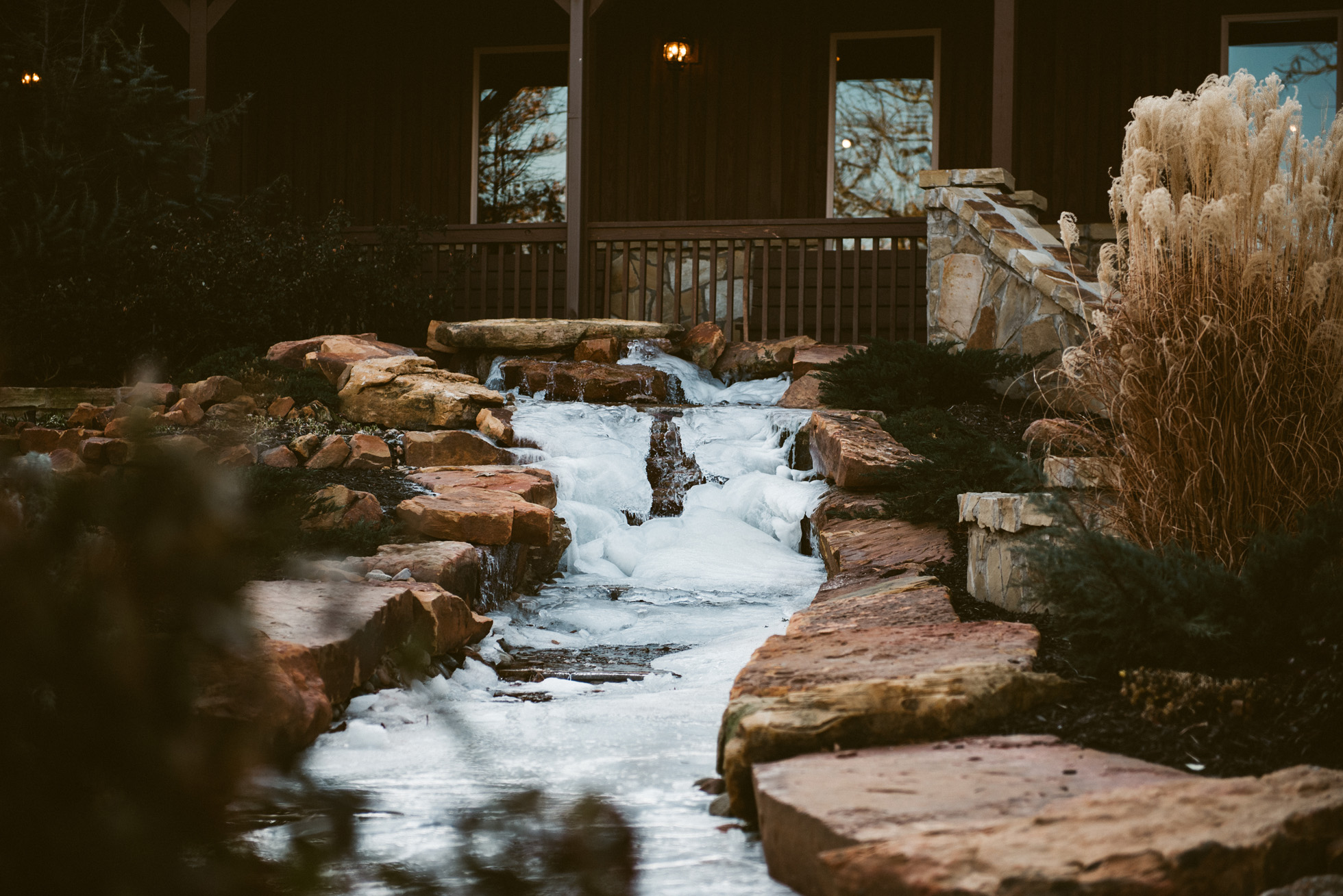 I’ll come out and say it, it was cold! But looking back over the photos, you would think it was a beautiful day…because it was! Jody and Amanda wanted to have a winter wedding so the weather was no surprise. As their big day started, I will never forget all the feels during Amanda’s first look with her Dad. Watching the proud look on his face, and off to the side, her mom welling up with happy tears. Truly, I can’t get enough of this lovely winter wedding. It was cold, freezing, and windy by Skiatook Lake that day even with the bright sun. But there was Amanda, excited, all smiles, exuding joy, and Jody was stoic and handsome as ever. Jody had proposed to Amanda on a hiking trip through Galcier National Park. They are a brave and well travelled couple. So I knew they would be up for anything. The guests cautiously headed outside, snatching a blanket wedding favor along the way. And everyone will forever remember the fun burst of confetti and excitement during this gorgeous couple’s first kiss. They watched the sun set softly over the lake while trying to keep warm with Amanda’s fur wrap and each other’s embrace. The Springs Event Venue in Tulsa, OK was gorgeous! The water bubbling through the ice encrusted stream, and the bridge fringed with pampas grass set against the lakeside backdrop was totally picturesque. The elegant affair was quickly turned into a colorful dance party. Glow sticks danced in the air as a large Love marquee sparkled in the background. The couple was sent off to their next adventure with cheers and of course…more confetti!
