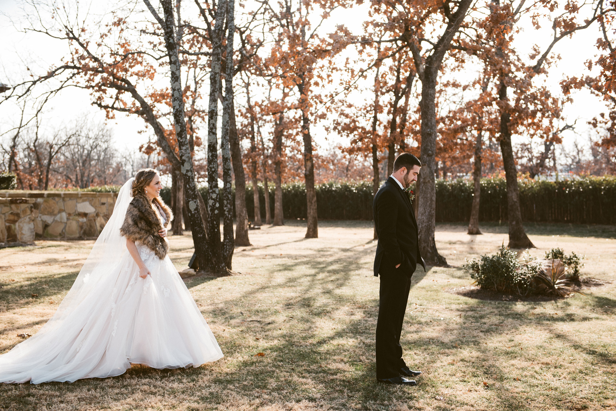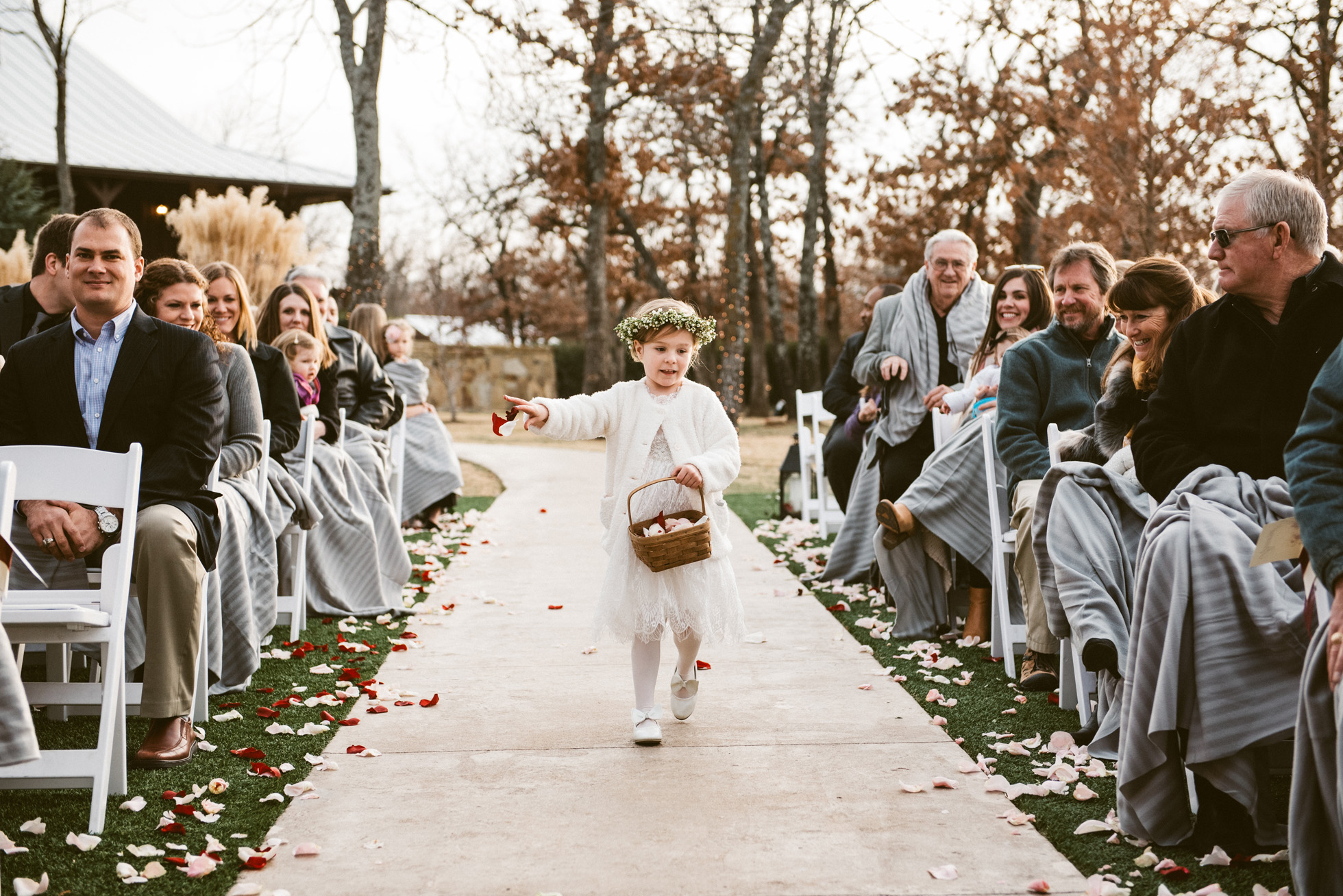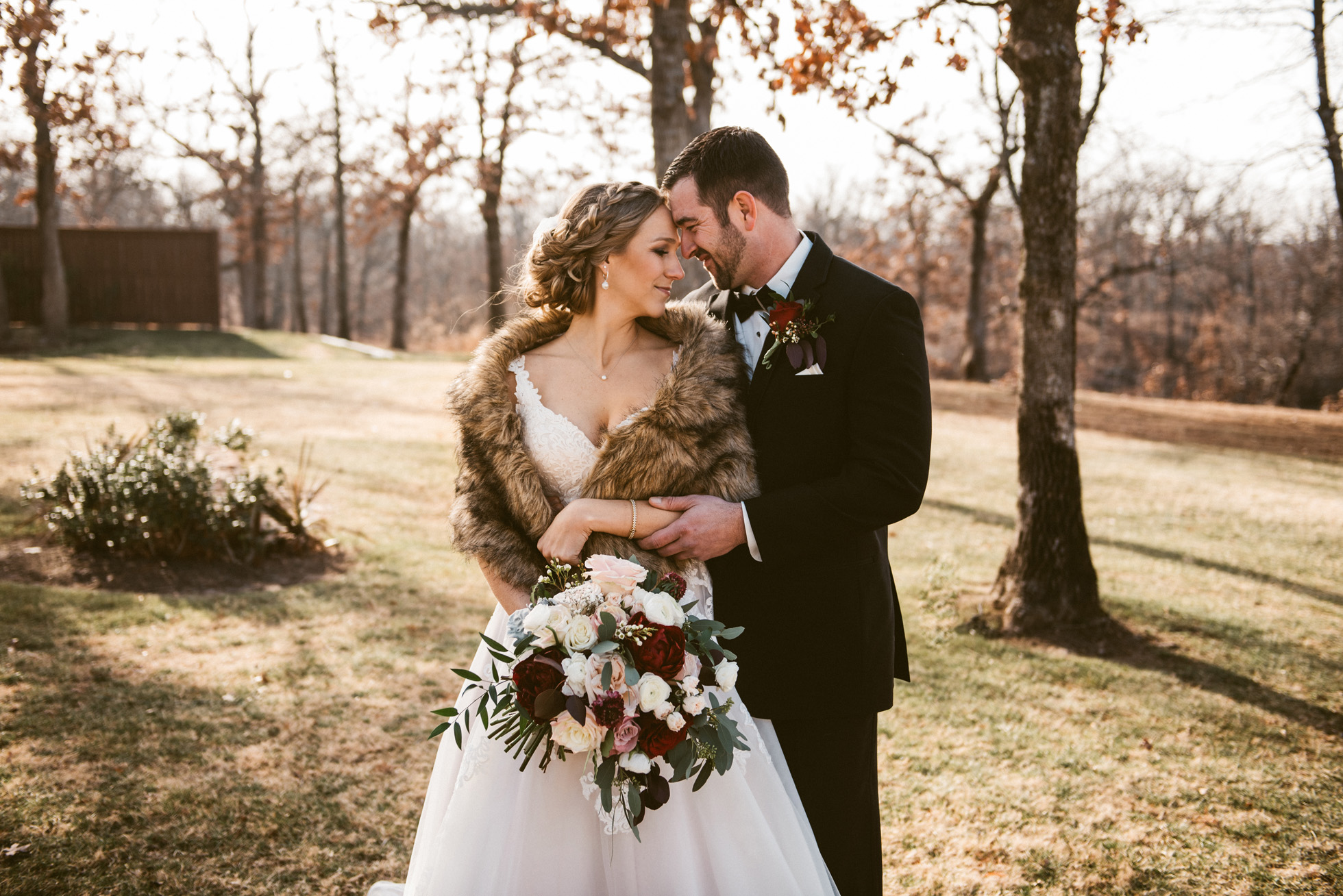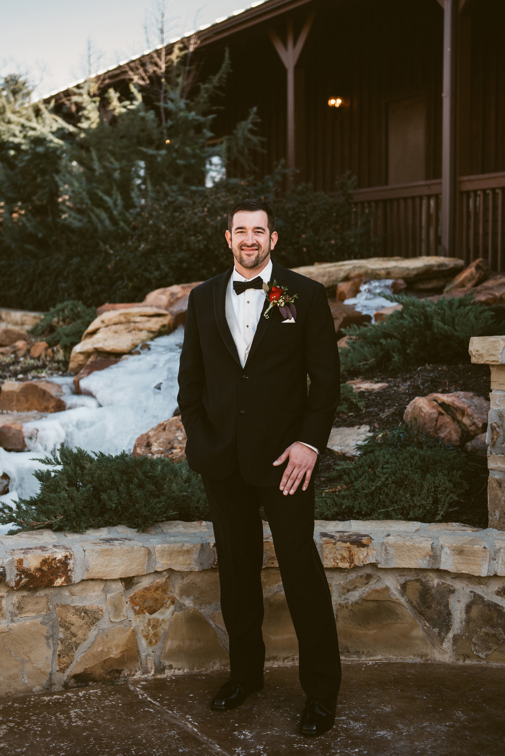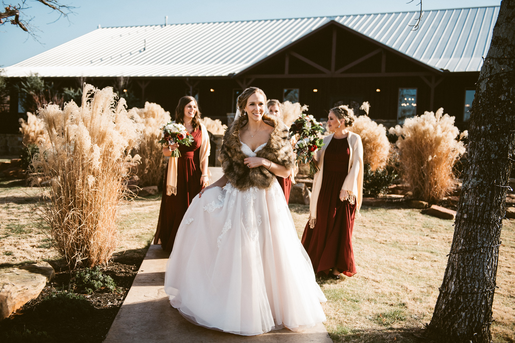 I’ll come out and say it, it was cold! But looking back over the photos, you would think it was a beautiful day…because it was! Jody and Amanda wanted to have a winter wedding so the weather was no surprise. As their big day started, I will never forget all the feels during Amanda’s first look with her Dad. Watching the proud look on his face, and off to the side, her mom welling up with happy tears. Truly, I can’t get enough of this lovely winter wedding. It was cold, freezing, and windy by Skiatook Lake that day even with the bright sun. But there was Amanda, excited, all smiles, exuding joy, and Jody was stoic and handsome as ever. Jody had proposed to Amanda on a hiking trip through Galcier National Park. They are a brave and well travelled couple. So I knew they would be up for anything. The guests cautiously headed outside, snatching a blanket wedding favor along the way. And everyone will forever remember the fun burst of confetti and excitement during this gorgeous couple’s first kiss. They watched the sun set softly over the lake while trying to keep warm with Amanda’s fur wrap and each other’s embrace. The Springs Event Venue in Tulsa, OK was gorgeous! The water bubbling through the ice encrusted stream, and the bridge fringed with pampas grass set against the lakeside backdrop was totally picturesque. The elegant affair was quickly turned into a colorful dance party. Glow sticks danced in the air as a large Love marquee sparkled in the background. The couple was sent off to their next adventure with cheers and of course…more confetti!
