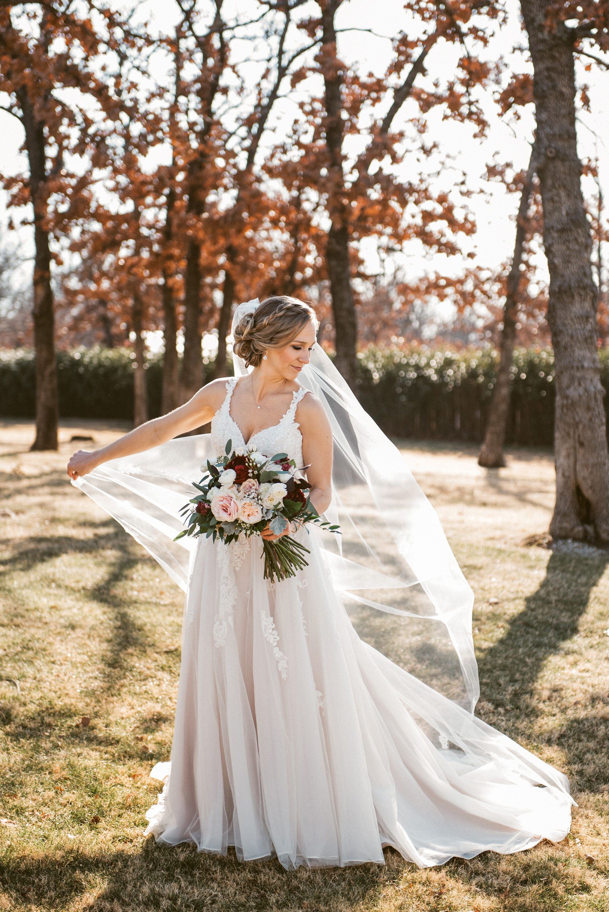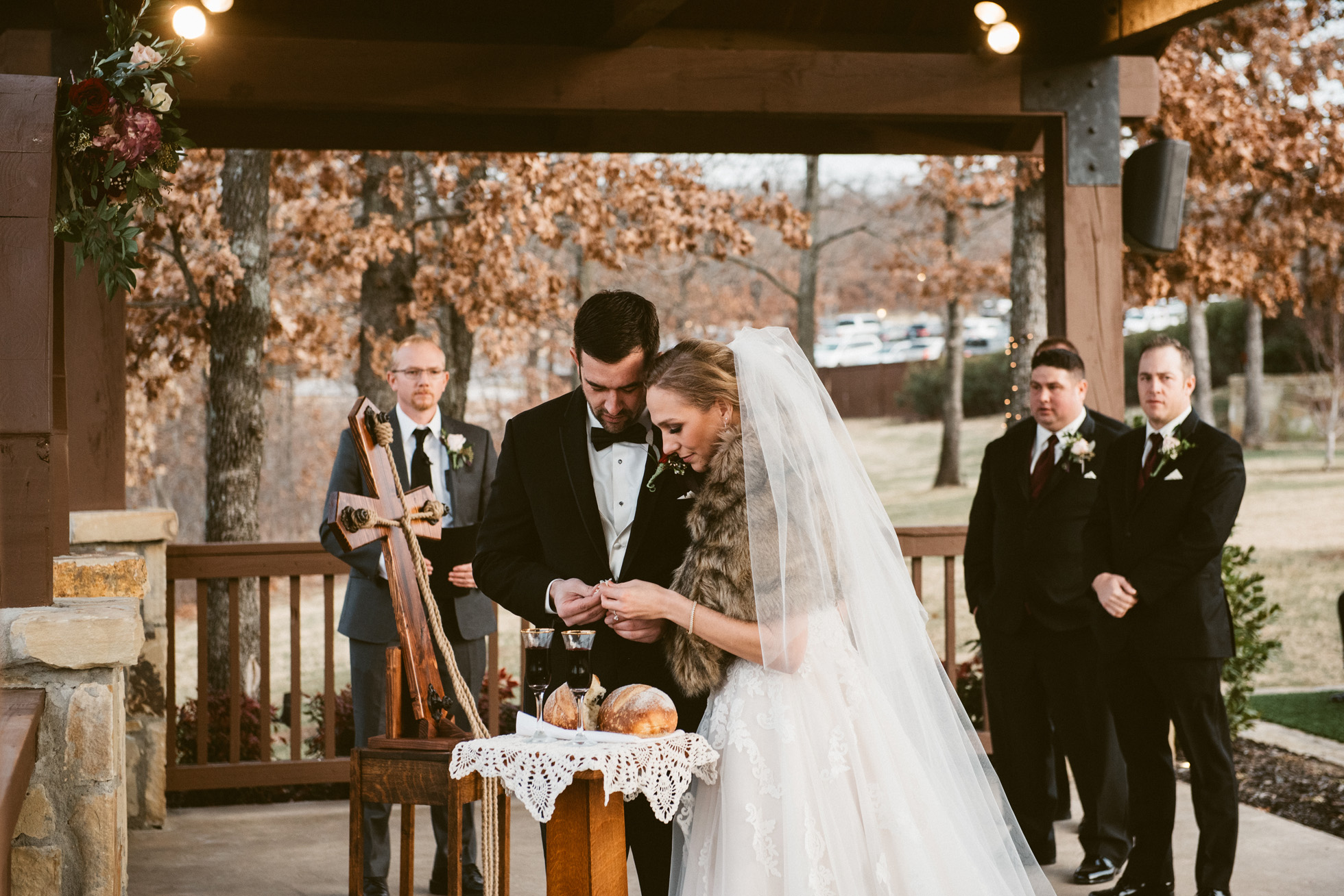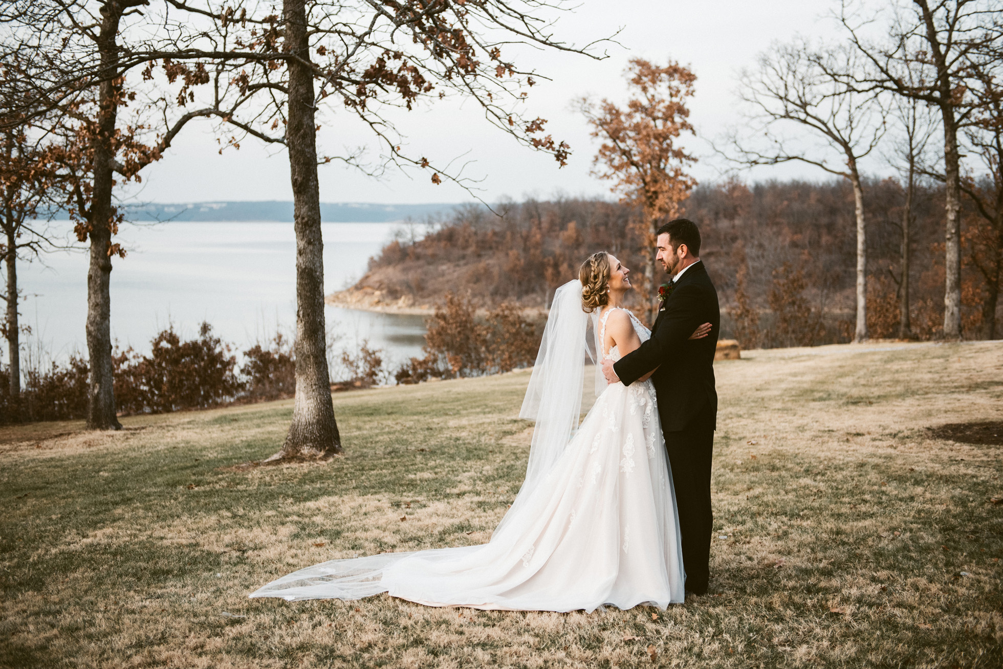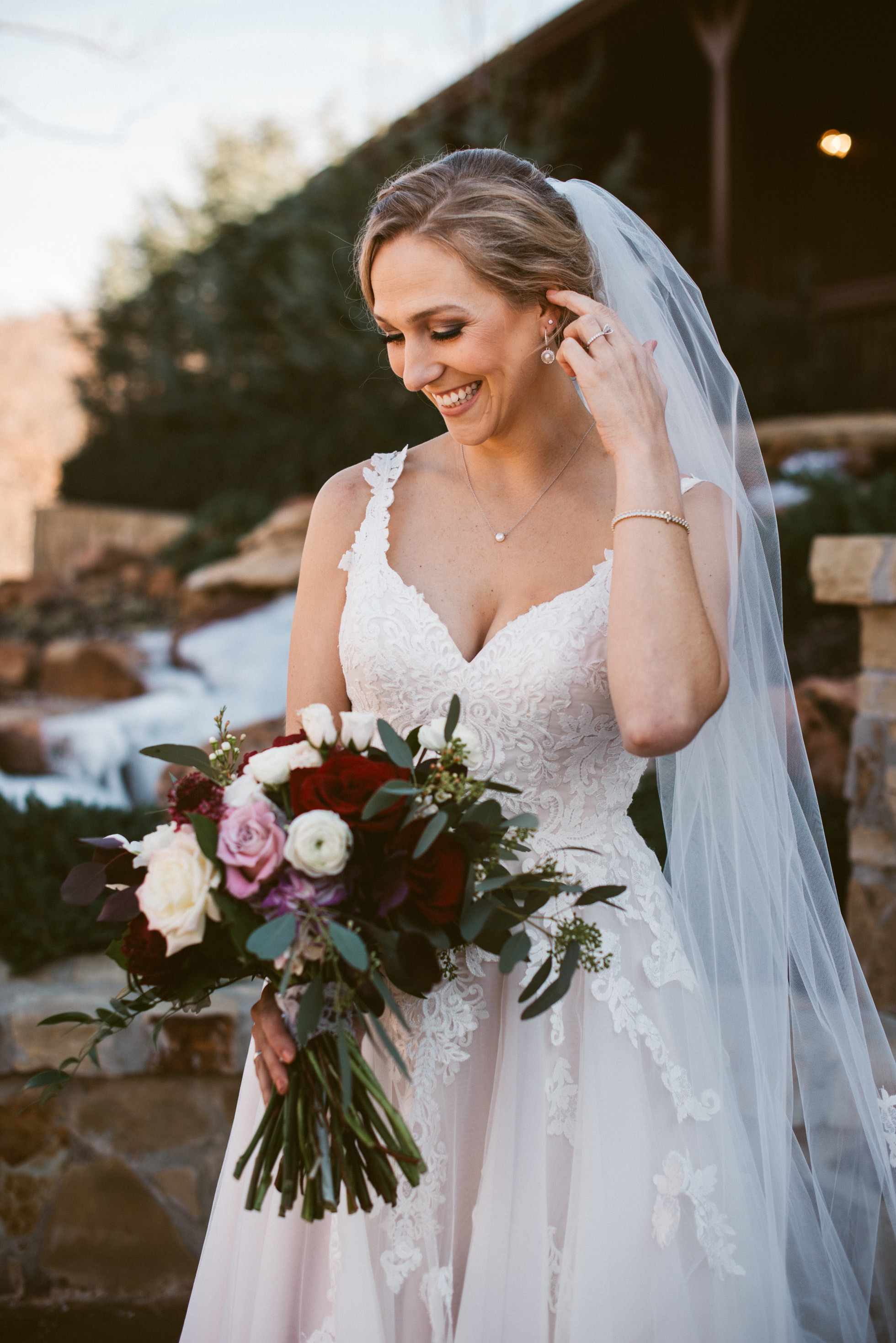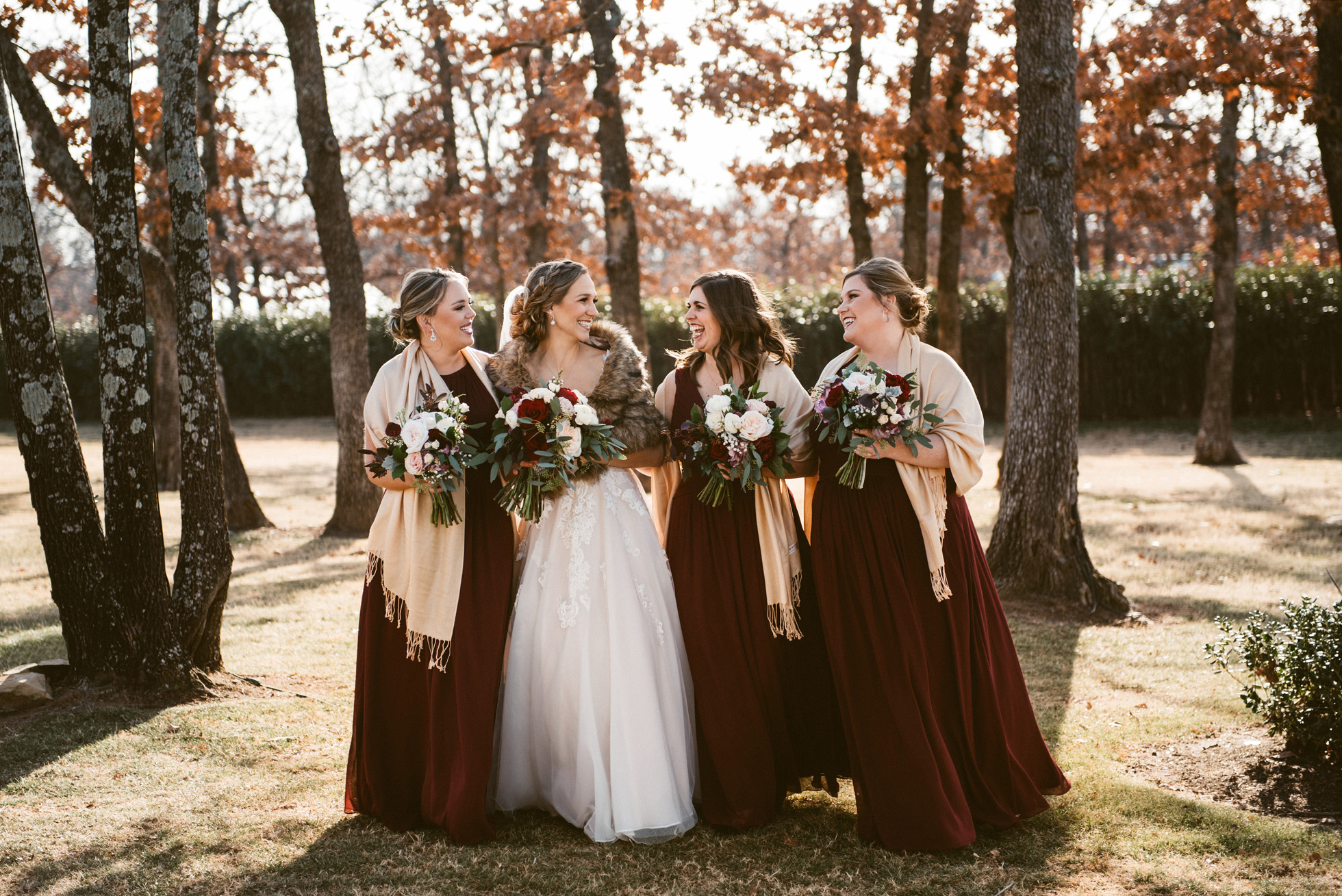 I’ll come out and say it, it was cold! But looking back over the photos, you would think it was a beautiful day…because it was! Jody and Amanda wanted to have a winter wedding so the weather was no surprise. As their big day started, I will never forget all the feels during Amanda’s first look with her Dad. Watching the proud look on his face, and off to the side, her mom welling up with happy tears. Truly, I can’t get enough of this lovely winter wedding. It was cold, freezing, and windy by Skiatook Lake that day even with the bright sun. But there was Amanda, excited, all smiles, exuding joy, and Jody was stoic and handsome as ever. Jody had proposed to Amanda on a hiking trip through Galcier National Park. They are a brave and well travelled couple. So I knew they would be up for anything. The guests cautiously headed outside, snatching a blanket wedding favor along the way. And everyone will forever remember the fun burst of confetti and excitement during this gorgeous couple’s first kiss. They watched the sun set softly over the lake while trying to keep warm with Amanda’s fur wrap and each other’s embrace. The Springs Event Venue in Tulsa, OK was gorgeous! The water bubbling through the ice encrusted stream, and the bridge fringed with pampas grass set against the lakeside backdrop was totally picturesque. The elegant affair was quickly turned into a colorful dance party. Glow sticks danced in the air as a large Love marquee sparkled in the background. The couple was sent off to their next adventure with cheers and of course…more confetti!
