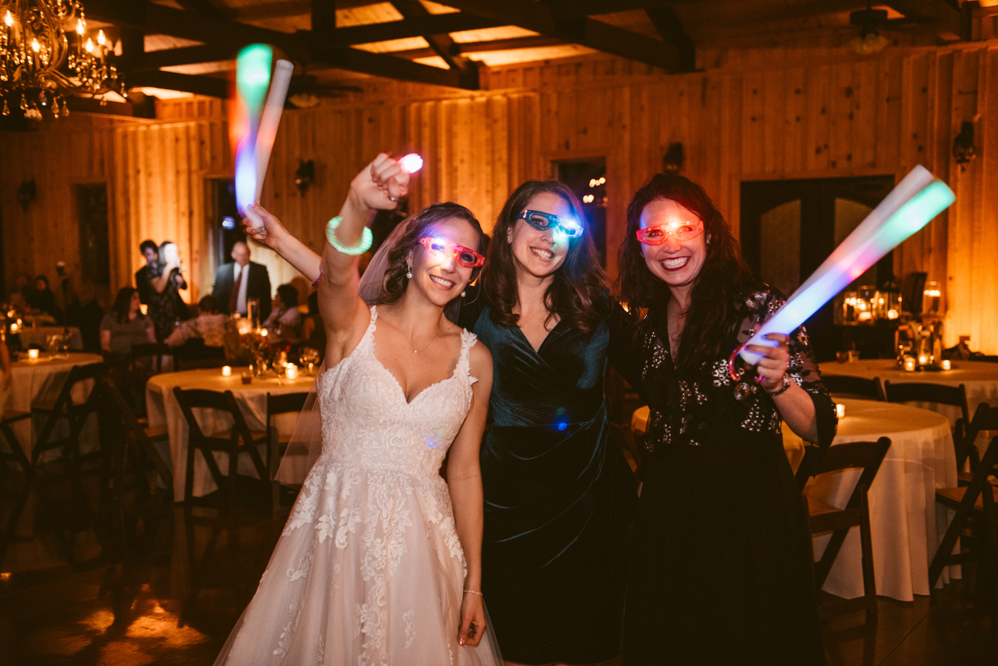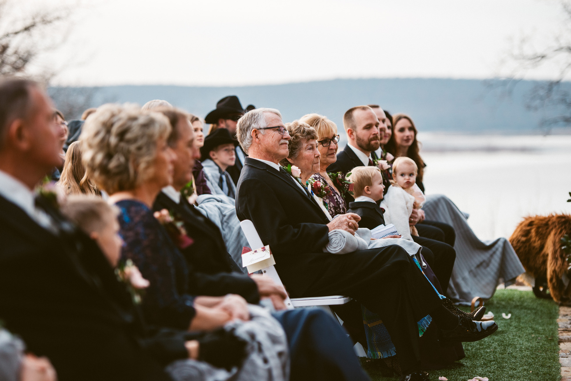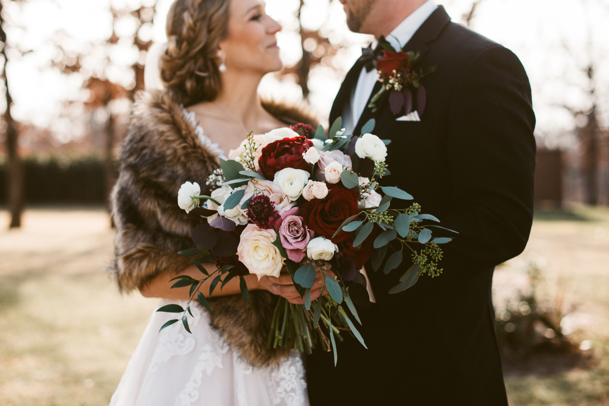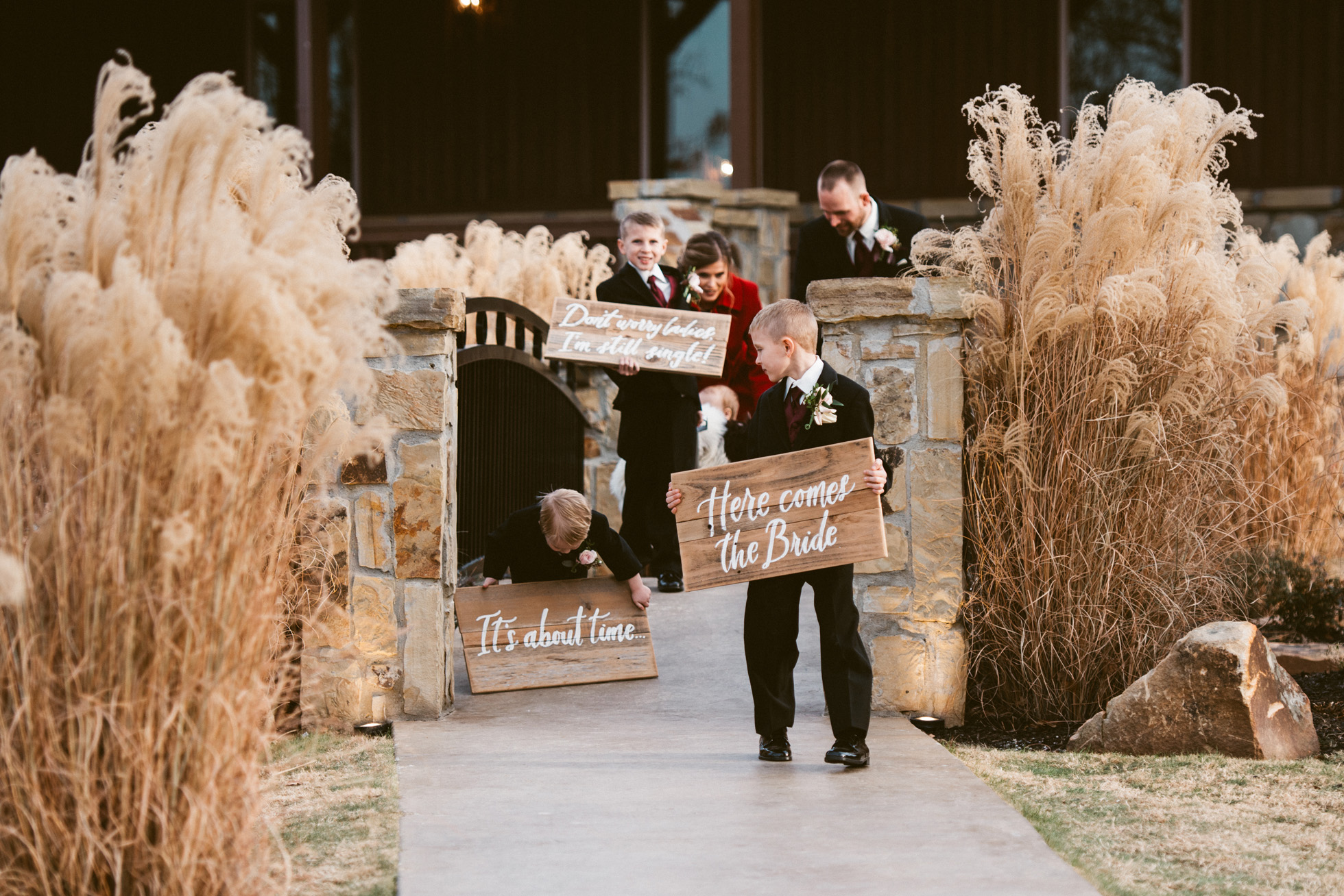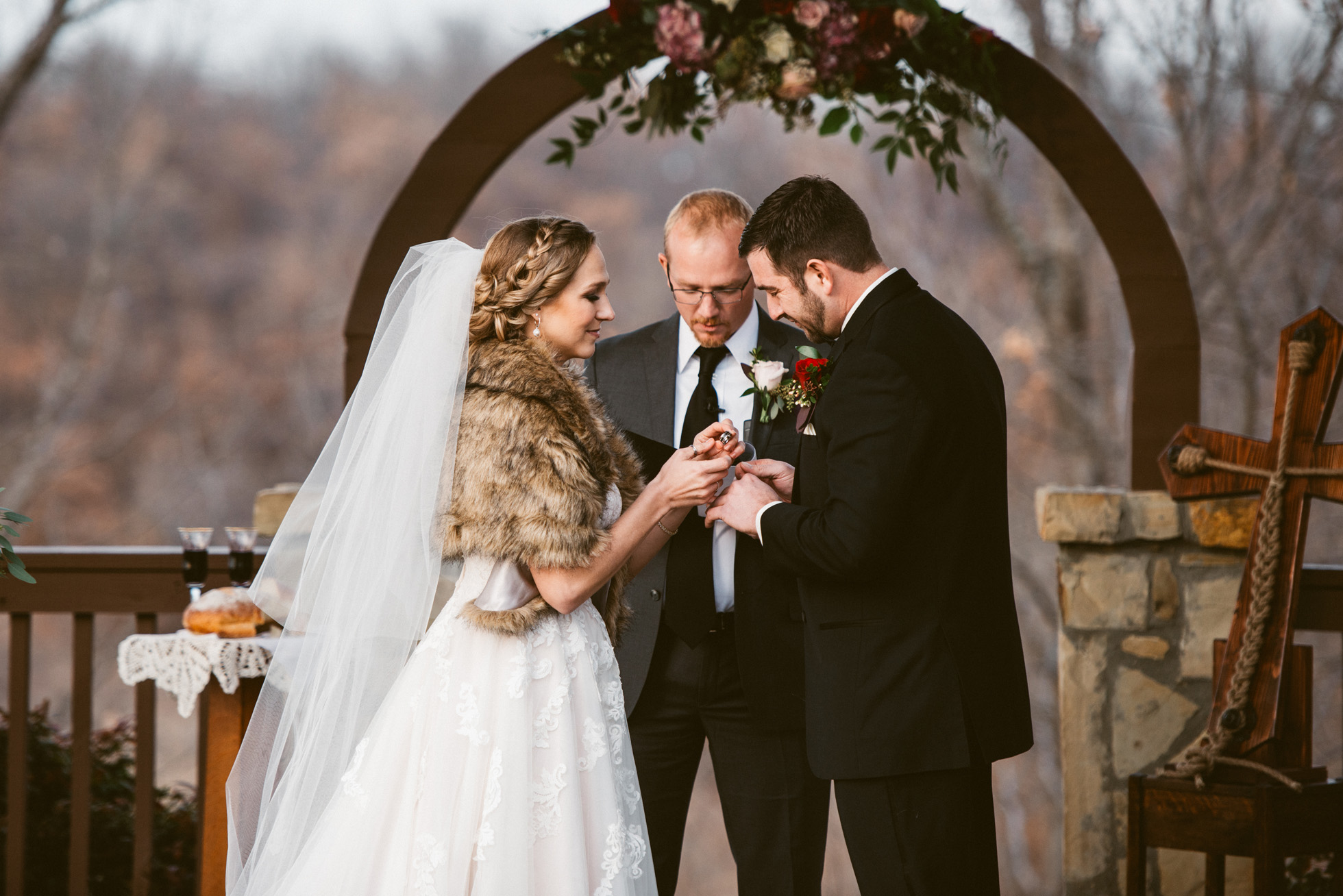 I’ll come out and say it, it was cold! But looking back over the photos, you would think it was a beautiful day…because it was! Jody and Amanda wanted to have a winter wedding so the weather was no surprise. As their big day started, I will never forget all the feels during Amanda’s first look with her Dad. Watching the proud look on his face, and off to the side, her mom welling up with happy tears. Truly, I can’t get enough of this lovely winter wedding. It was cold, freezing, and windy by Skiatook Lake that day even with the bright sun. But there was Amanda, excited, all smiles, exuding joy, and Jody was stoic and handsome as ever. Jody had proposed to Amanda on a hiking trip through Galcier National Park. They are a brave and well travelled couple. So I knew they would be up for anything. The guests cautiously headed outside, snatching a blanket wedding favor along the way. And everyone will forever remember the fun burst of confetti and excitement during this gorgeous couple’s first kiss. They watched the sun set softly over the lake while trying to keep warm with Amanda’s fur wrap and each other’s embrace. The Springs Event Venue in Tulsa, OK was gorgeous! The water bubbling through the ice encrusted stream, and the bridge fringed with pampas grass set against the lakeside backdrop was totally picturesque. The elegant affair was quickly turned into a colorful dance party. Glow sticks danced in the air as a large Love marquee sparkled in the background. The couple was sent off to their next adventure with cheers and of course…more confetti!