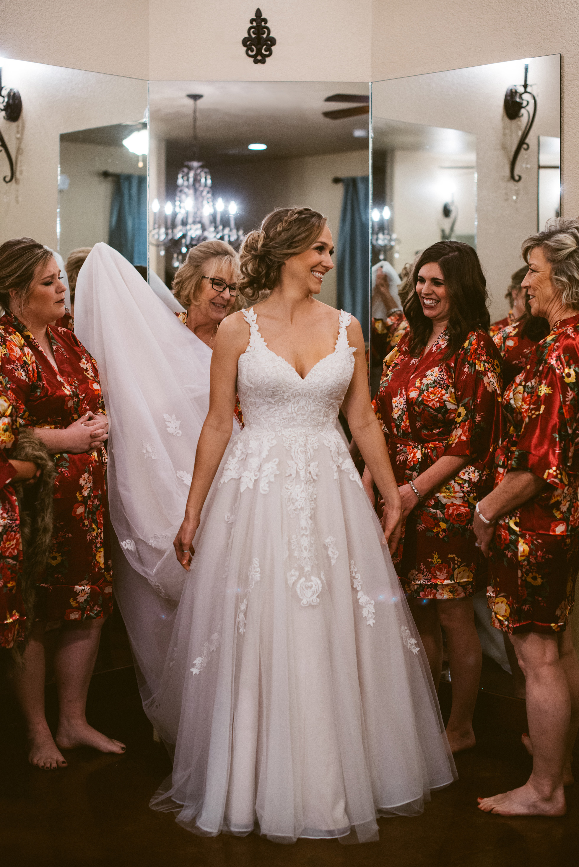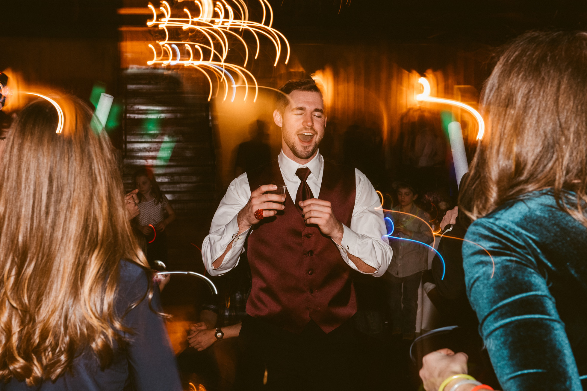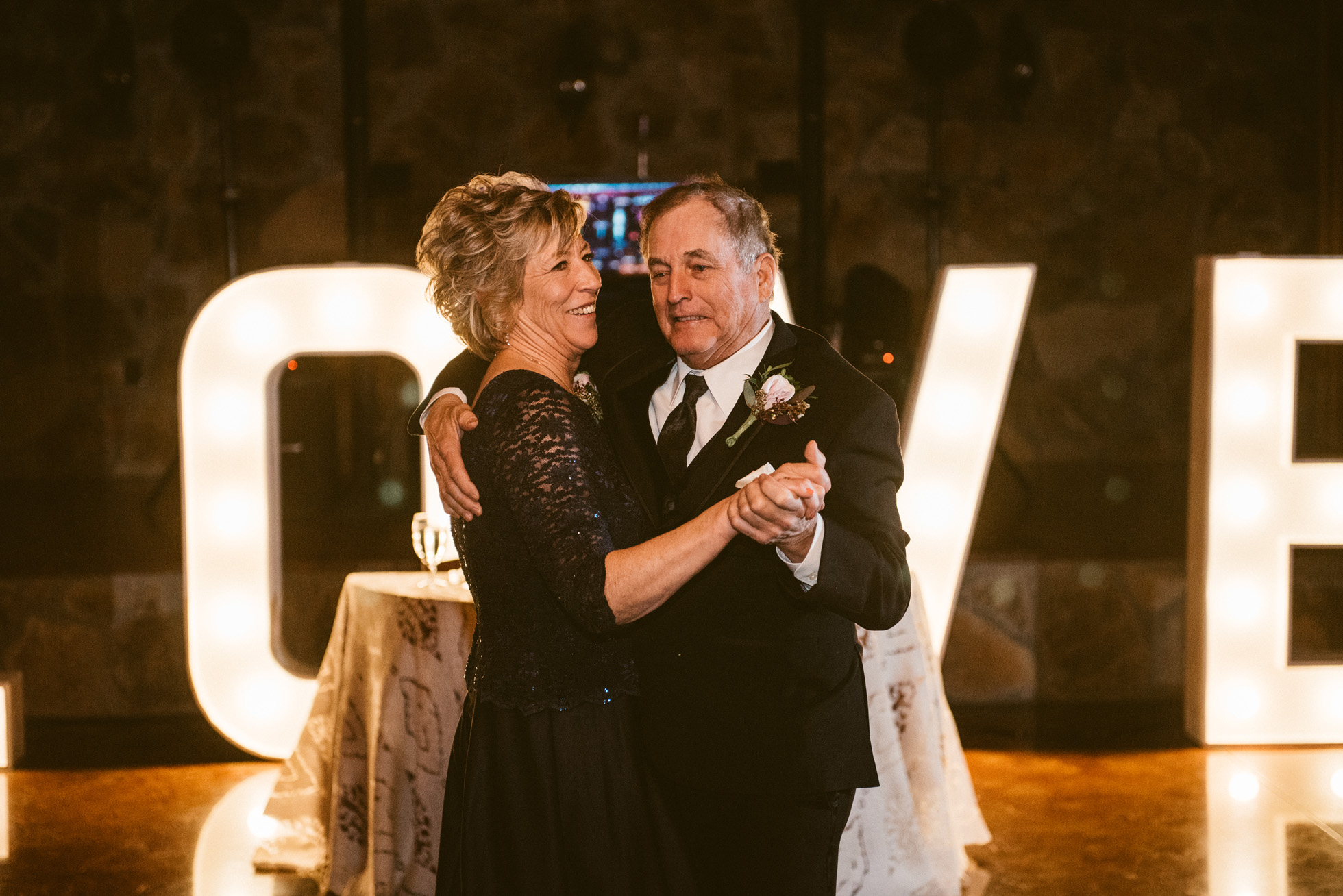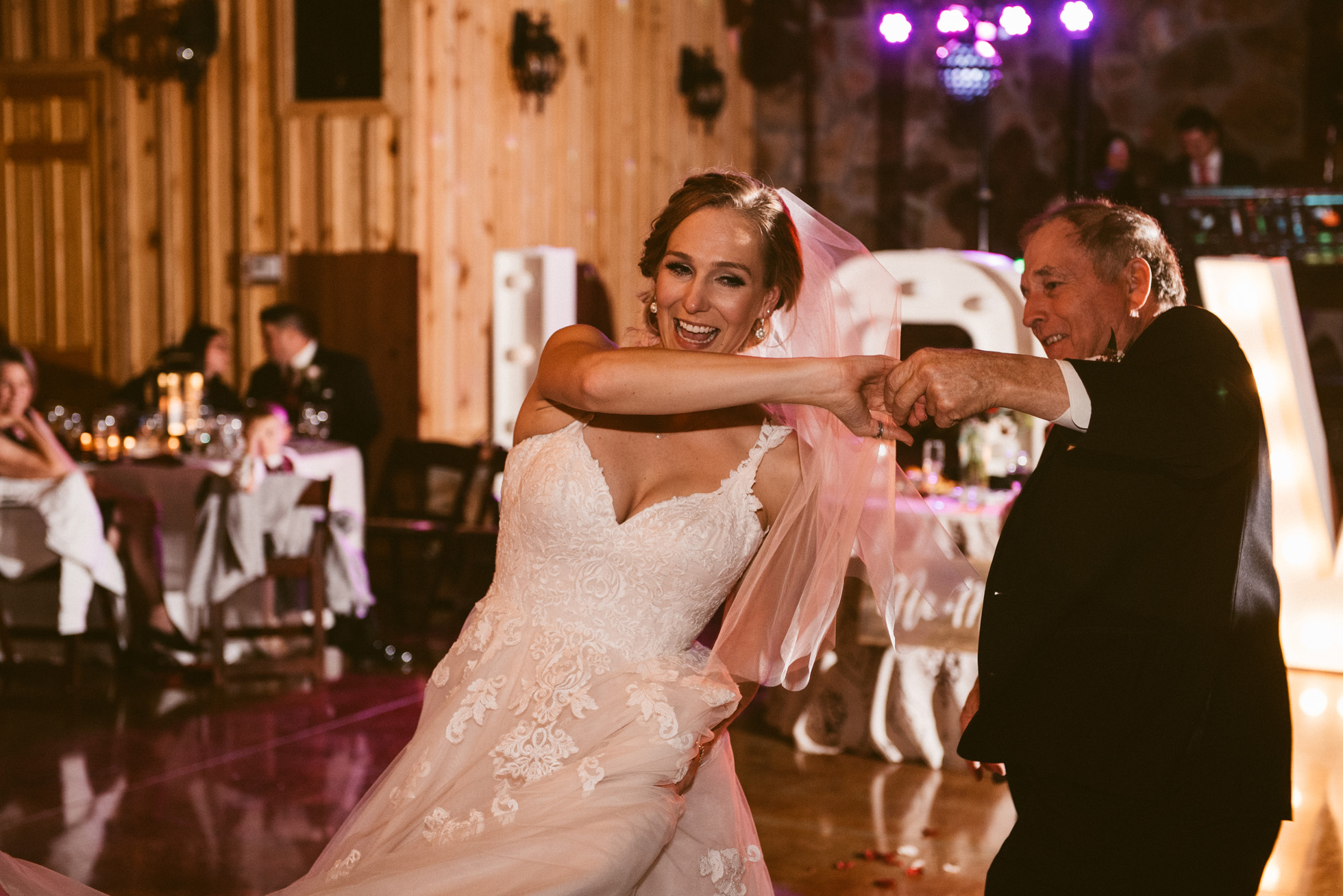 I’ll come out and say it, it was cold! But looking back over the photos, you would think it was a beautiful day…because it was! Jody and Amanda wanted to have a winter wedding so the weather was no surprise. As their big day started, I will never forget all the feels during Amanda’s first look with her Dad. Watching the proud look on his face, and off to the side, her mom welling up with happy tears. Truly, I can’t get enough of this lovely winter wedding. It was cold, freezing, and windy by Skiatook Lake that day even with the bright sun. But there was Amanda, excited, all smiles, exuding joy, and Jody was stoic and handsome as ever. Jody had proposed to Amanda on a hiking trip through Galcier National Park. They are a brave and well travelled couple. So I knew they would be up for anything. The guests cautiously headed outside, snatching a blanket wedding favor along the way. And everyone will forever remember the fun burst of confetti and excitement during this gorgeous couple’s first kiss. They watched the sun set softly over the lake while trying to keep warm with Amanda’s fur wrap and each other’s embrace. The Springs Event Venue in Tulsa, OK was gorgeous! The water bubbling through the ice encrusted stream, and the bridge fringed with pampas grass set against the lakeside backdrop was totally picturesque. The elegant affair was quickly turned into a colorful dance party. Glow sticks danced in the air as a large Love marquee sparkled in the background. The couple was sent off to their next adventure with cheers and of course…more confetti!