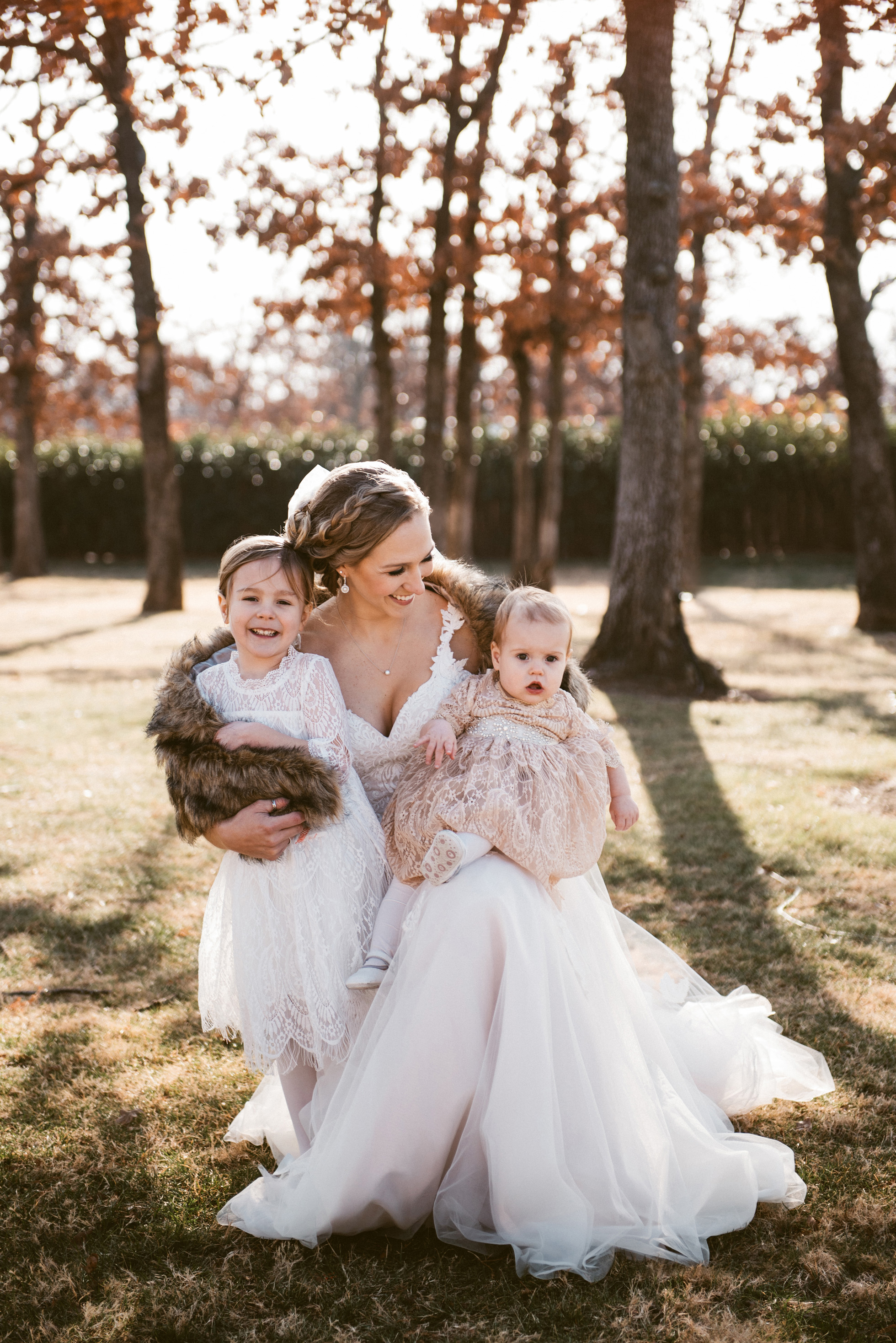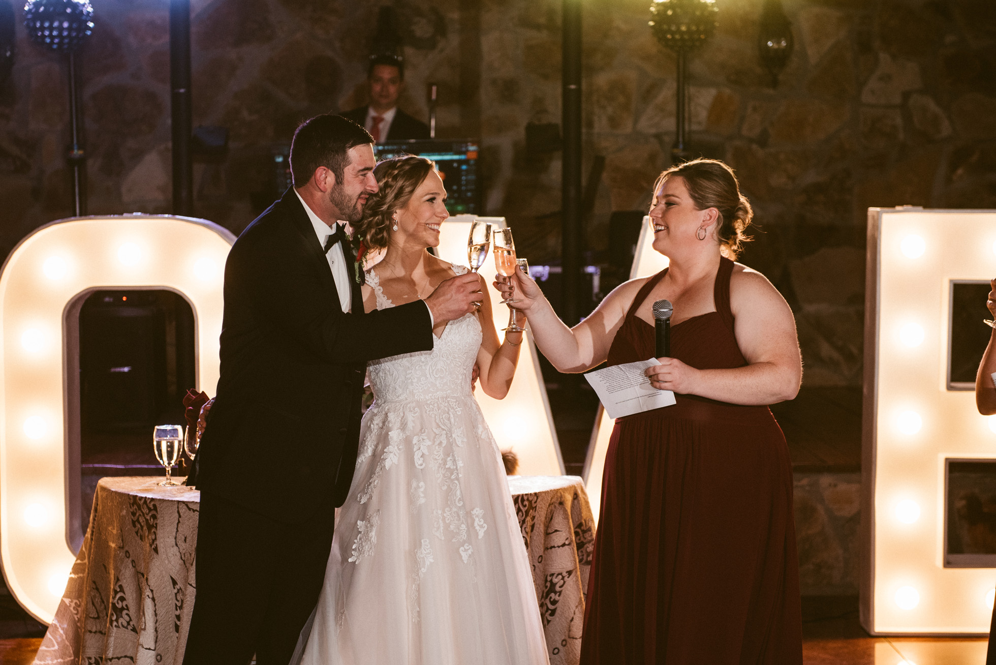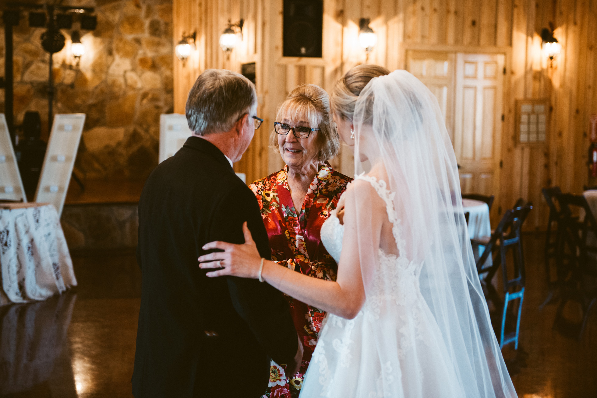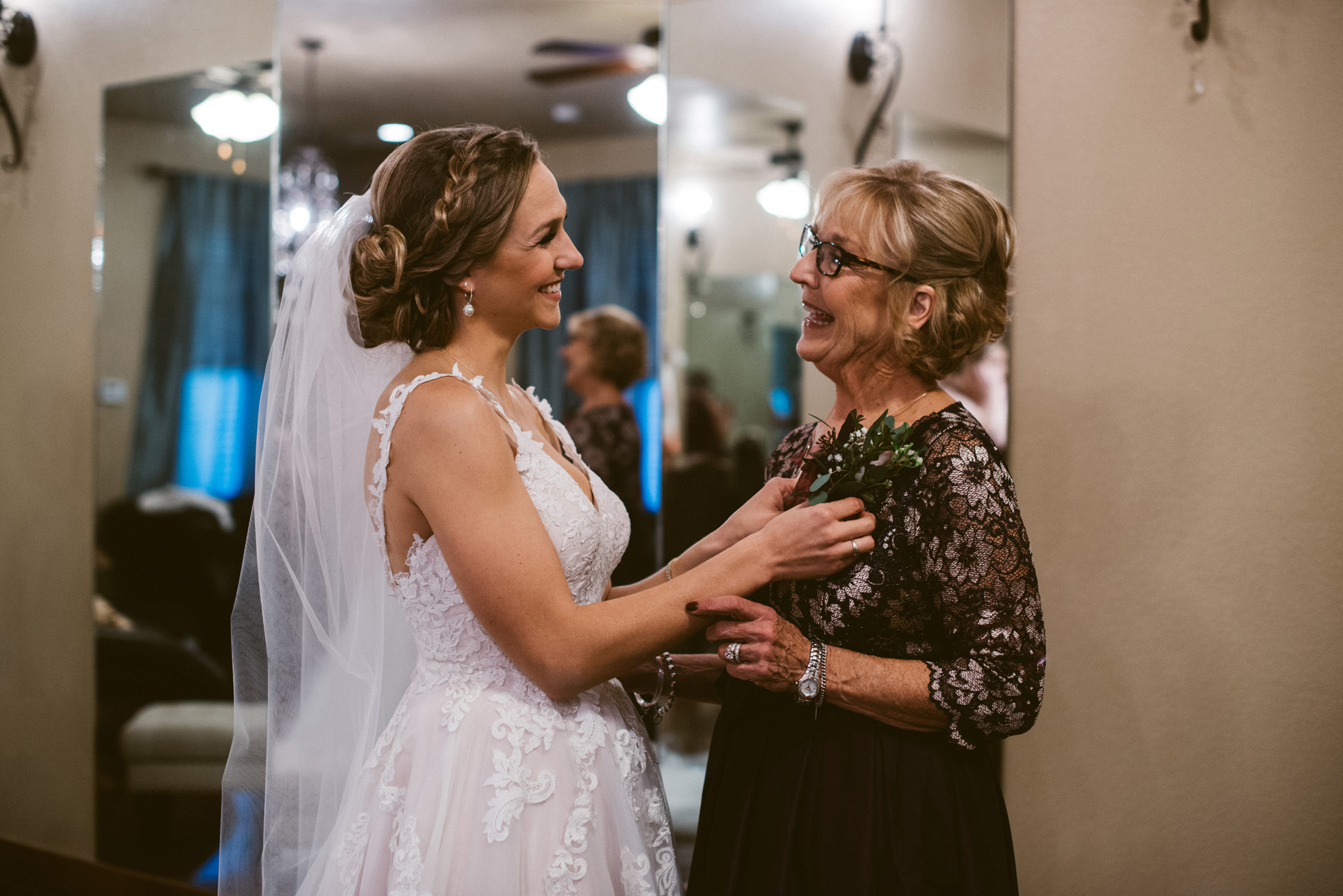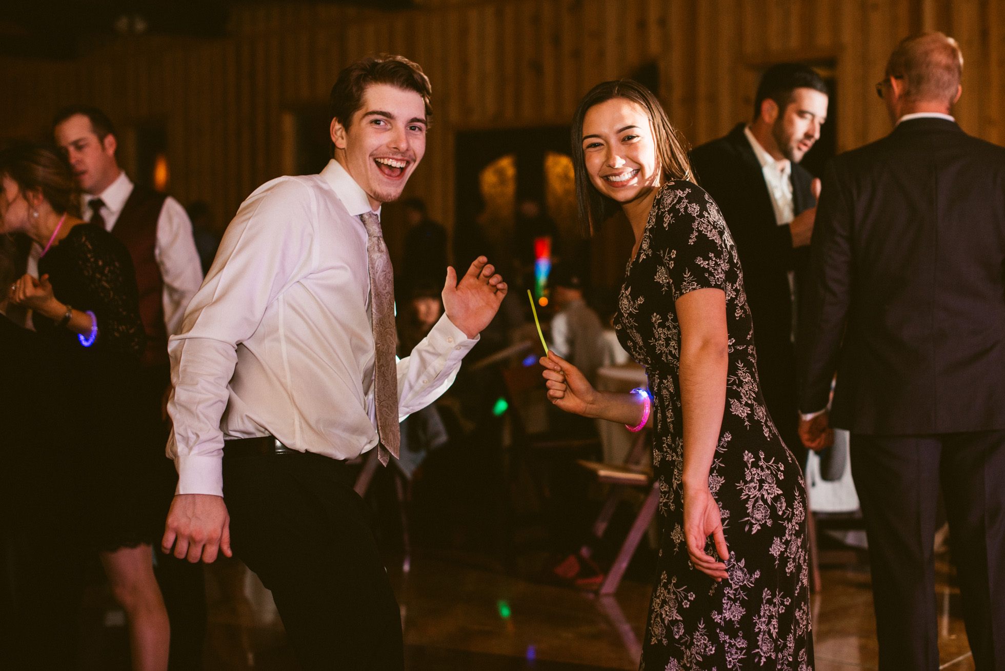 I’ll come out and say it, it was cold! But looking back over the photos, you would think it was a beautiful day…because it was! Jody and Amanda wanted to have a winter wedding so the weather was no surprise. As their big day started, I will never forget all the feels during Amanda’s first look with her Dad. Watching the proud look on his face, and off to the side, her mom welling up with happy tears. Truly, I can’t get enough of this lovely winter wedding. It was cold, freezing, and windy by Skiatook Lake that day even with the bright sun. But there was Amanda, excited, all smiles, exuding joy, and Jody was stoic and handsome as ever. Jody had proposed to Amanda on a hiking trip through Galcier National Park. They are a brave and well travelled couple. So I knew they would be up for anything. The guests cautiously headed outside, snatching a blanket wedding favor along the way. And everyone will forever remember the fun burst of confetti and excitement during this gorgeous couple’s first kiss. They watched the sun set softly over the lake while trying to keep warm with Amanda’s fur wrap and each other’s embrace. The Springs Event Venue in Tulsa, OK was gorgeous! The water bubbling through the ice encrusted stream, and the bridge fringed with pampas grass set against the lakeside backdrop was totally picturesque. The elegant affair was quickly turned into a colorful dance party. Glow sticks danced in the air as a large Love marquee sparkled in the background. The couple was sent off to their next adventure with cheers and of course…more confetti!